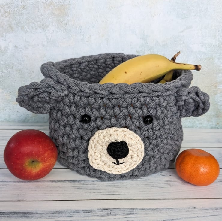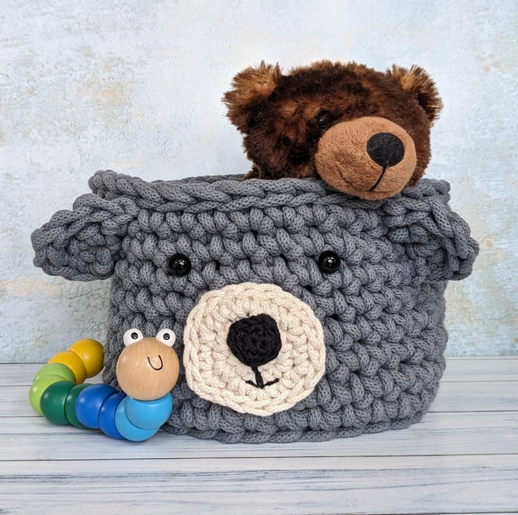 This basket is crocheted from a premium recycled thick braided cord decorated with a friendly bear's face. It would be perfect for storing small toys in a child's room, or used elsewhere in the house as a fun way to display a houseplant or even use as a fruit bowl