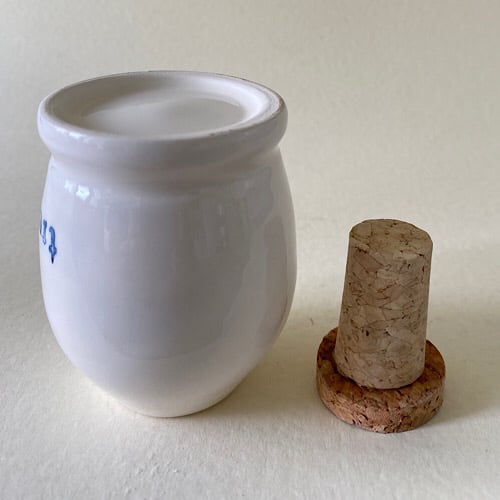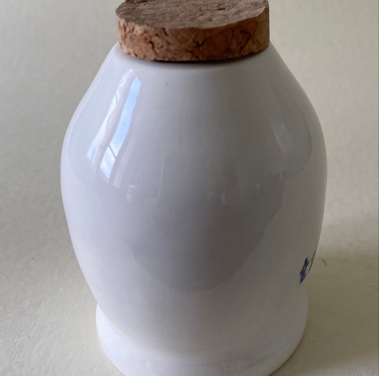 Handmade on my pottery wheel with a creamy white clay. The bottle has a mini cork & blue “Treats” indented on the front.