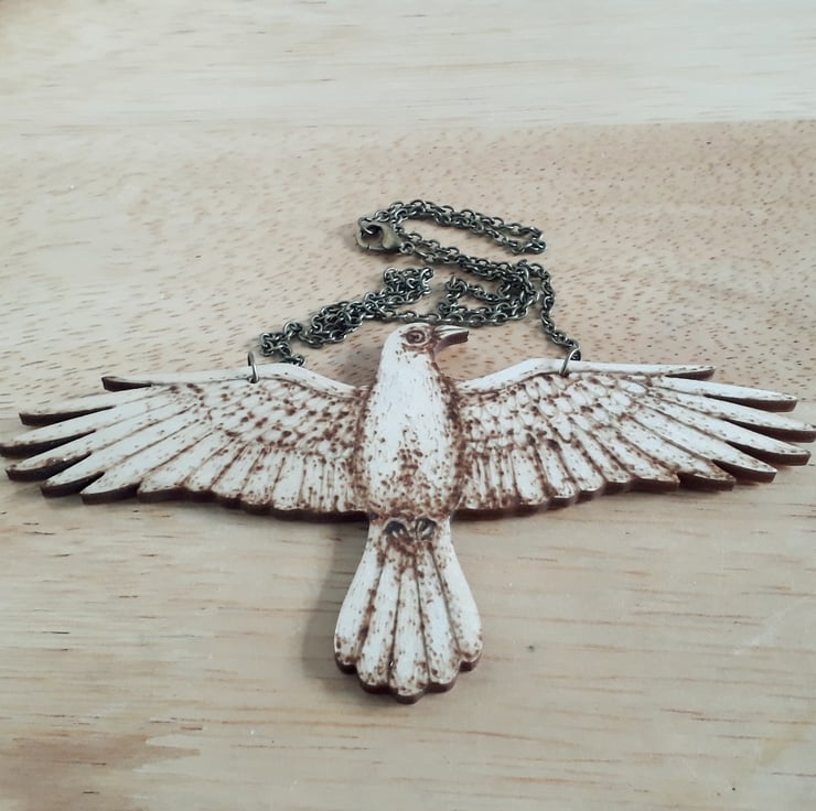 Wooden pendant of a crow decorated using pyrography (wood burning).