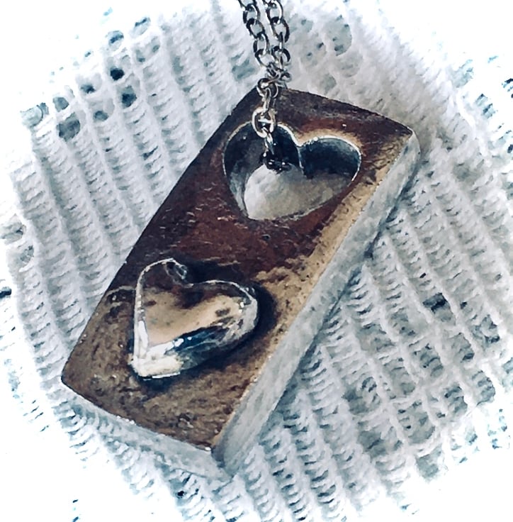 This pendant is a thick slice of solid 2cmx1cm silver with a cut out and embossed heart. Hangs on a fine Sterling silver chain. This a one off piece so unique in every way.