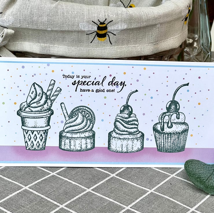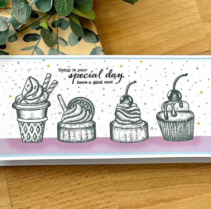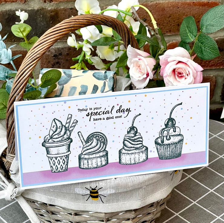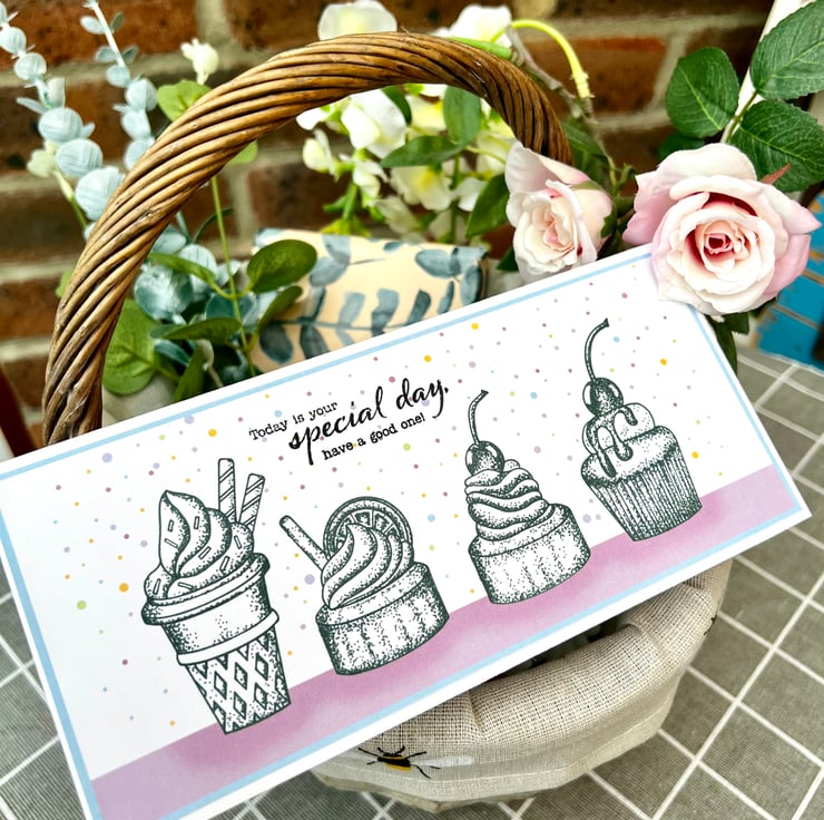 Birthday card - ‘Special Day’ Cupcakes. This card is DL is size which is approximately 9.9cm x 21cm. The card front has a colour print of my hand drawn pen illustration, featuring a selection of gorgeous decorative cakes. I finished this piece off on the computer to add a splash of colour.