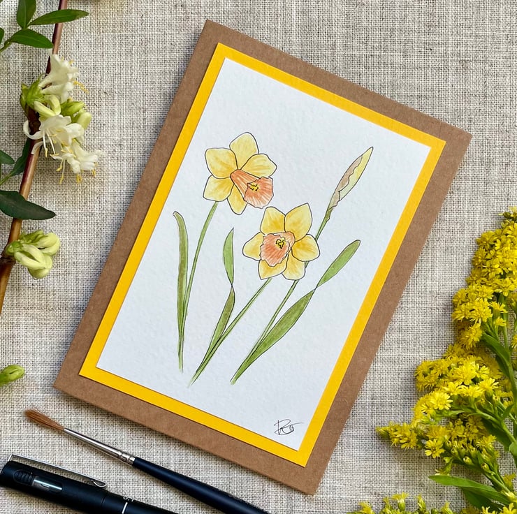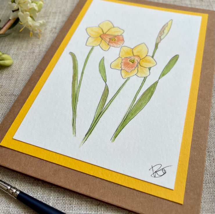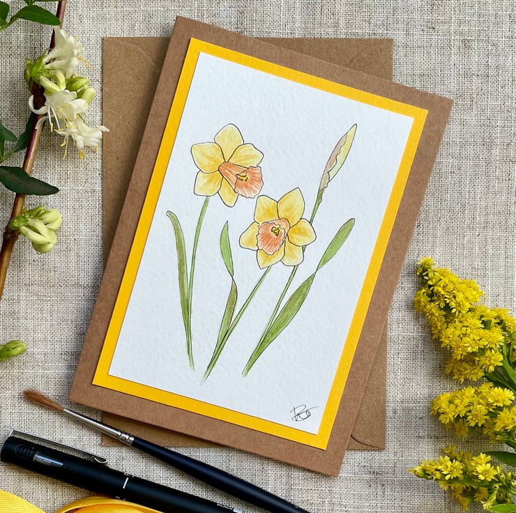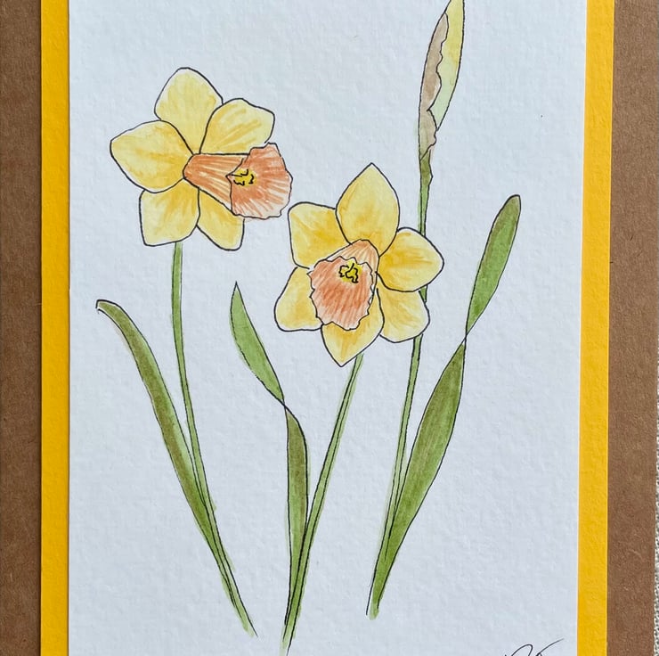 This blank greeting card features a little bunch of Daffodils, two of which are open and one in bud, hand drawn in ink pen and painted in watercolour and mounted onto a complementary sunny yellow background border, it is left blank for any occasion and would make a lovely card for a spring birthday, Mother's Day, or just sending a pretty note to a friend but could also be framed and put up on a wall or stood on a shelf/desk.