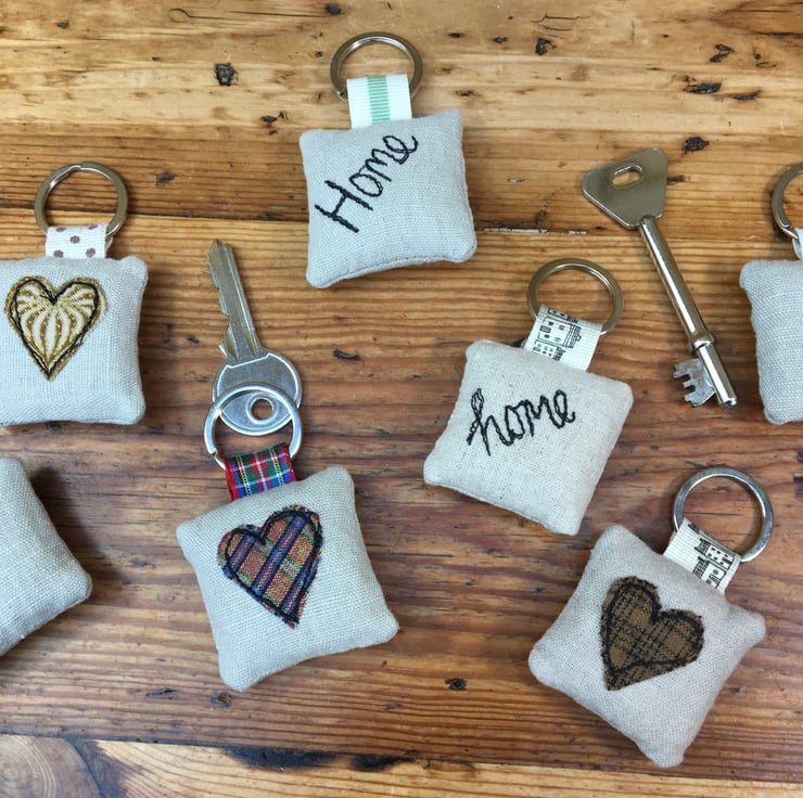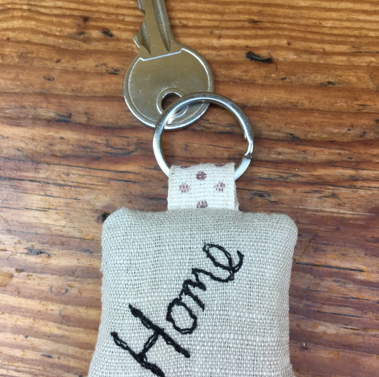 A charming handmade keyring to organise your house keys. Each keyring is unique as I use freehand machine embroidery on the natural linen. ‘Home’ is stitched on one side and a charming tweed heart is on the reverse side.