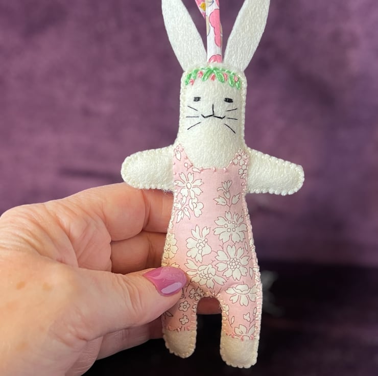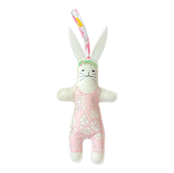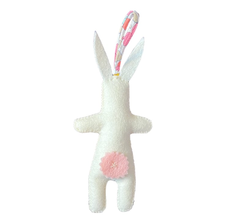 This exclusively designed, felt and Liberty Print fabric bunny hanging decoration has been made to be treasured over time. Its gifting possibilities are many including ; a baby’s Christening gift, welcome newborn baby gift , baby shower present or a birthday gift.
