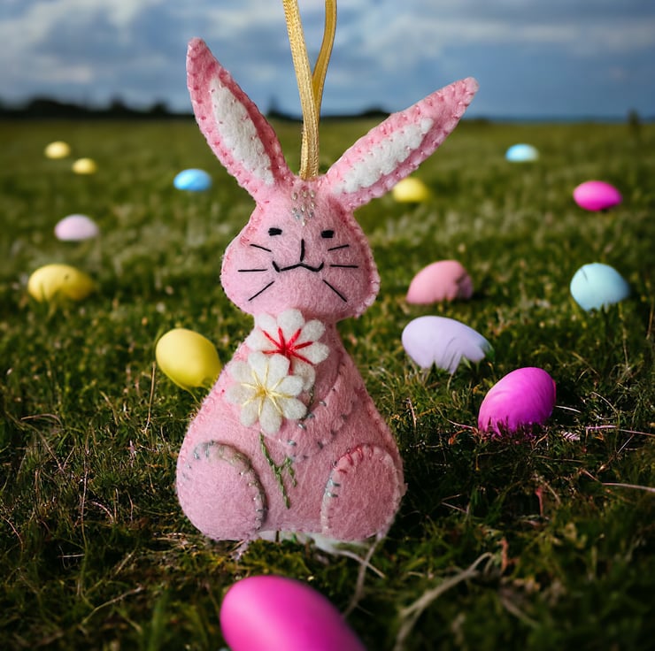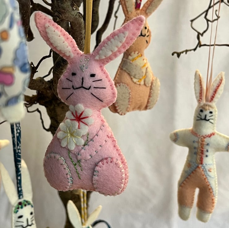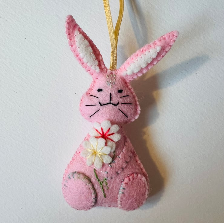 This beautifully made felt bunny hanging ornament with applique flowers would make a fabulous Easter tree decoration or a treasured addition to a child’s Easter basket. Made from pink felt and holding two felt flowers, this make is finished off with a cotton sateen hanger.