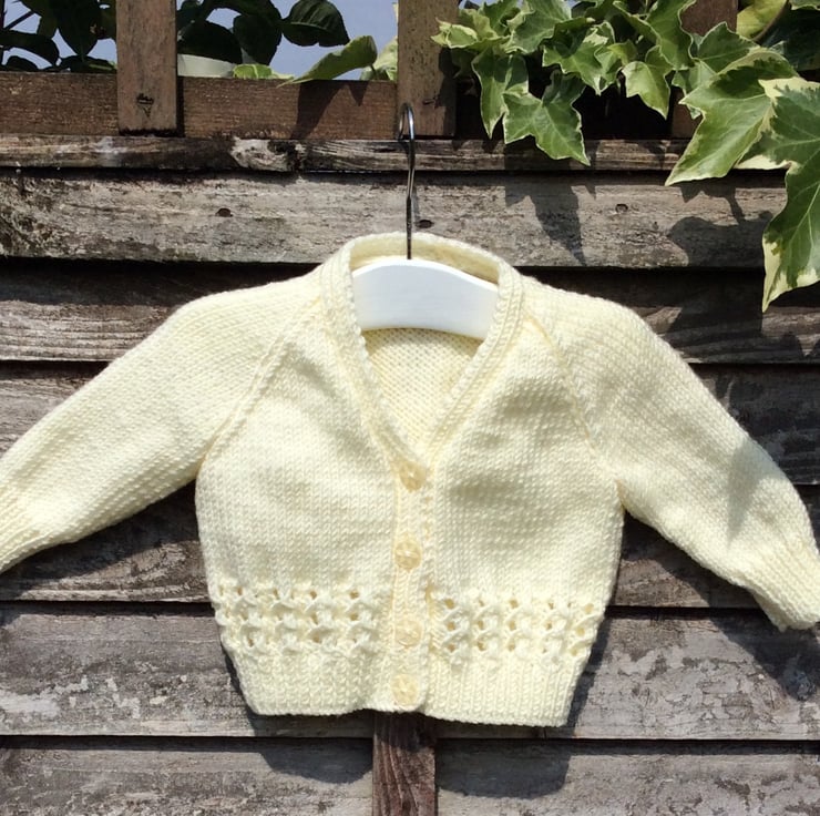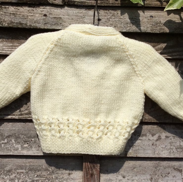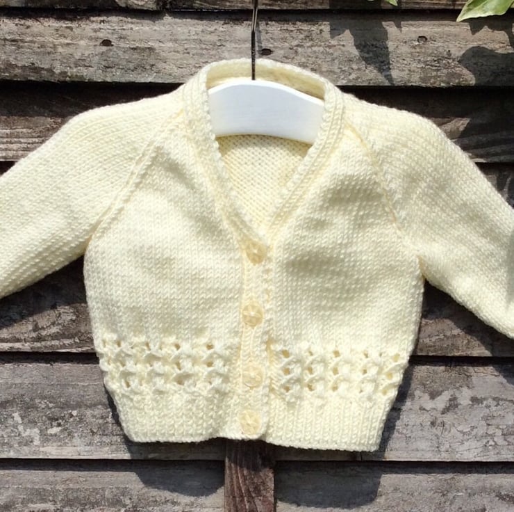 Gorgeous little baby cardigan hand knitted by me in my Suffolk home. I have used a top quality easy care baby yarn in a lovely neutral cream colour to knit this cardigan that has four matching baby buttons. A perfect addition to a little girl’s summer wardrobe. Made to fit a baby 6-12 months approximately.