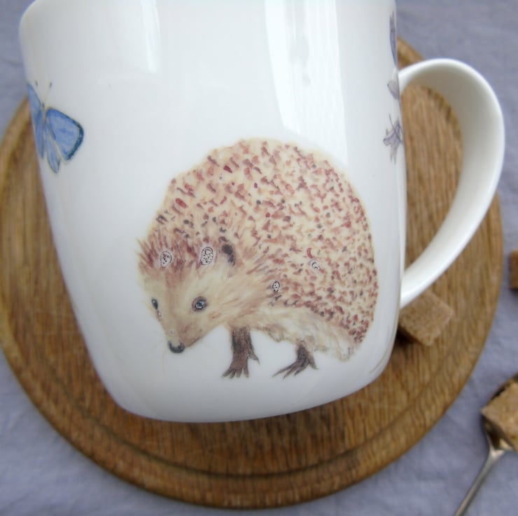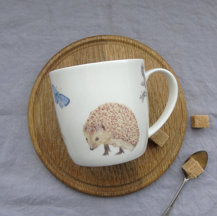 Bone china mug featuring my watercolour paintings of a cute hedgehog among woodland flowers.