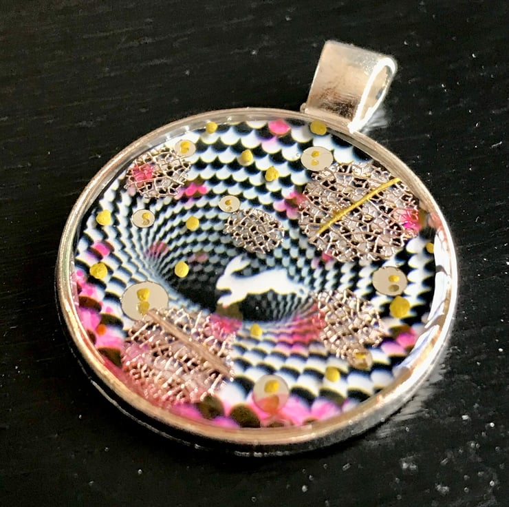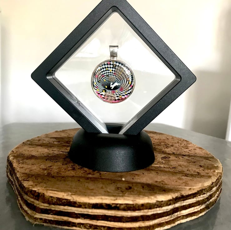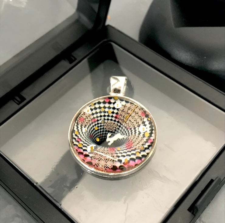 This handmade pendent is a one of a kind piece, a completely original miniature piece of art. Made Using optical illusion inspired by M.C Escher and Lewis Carol