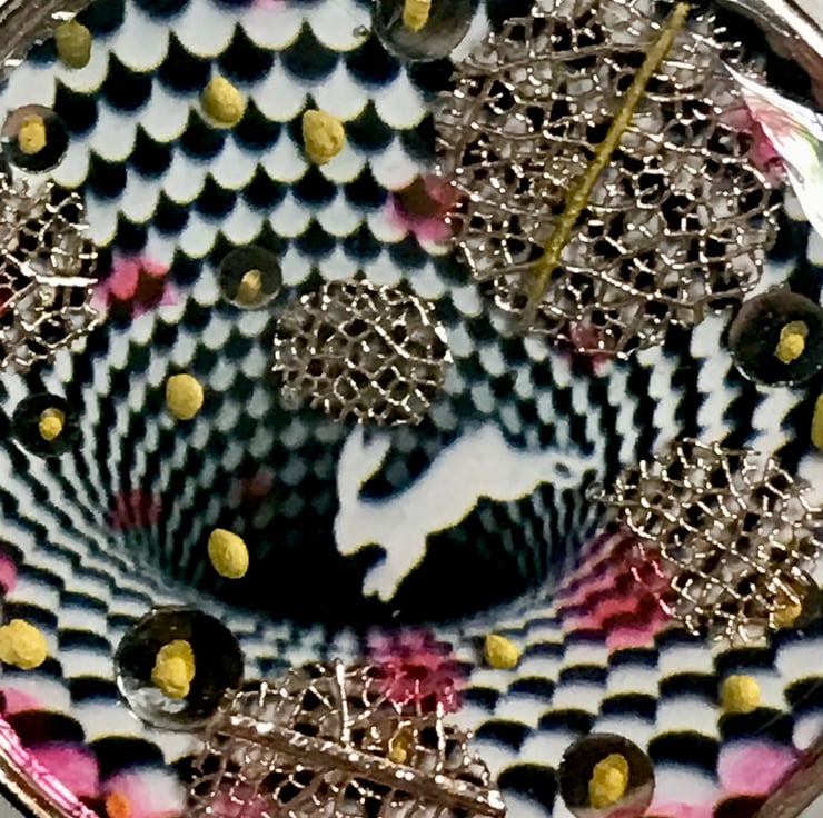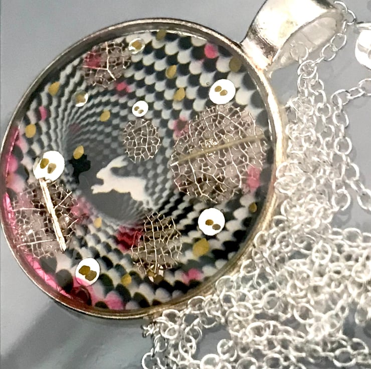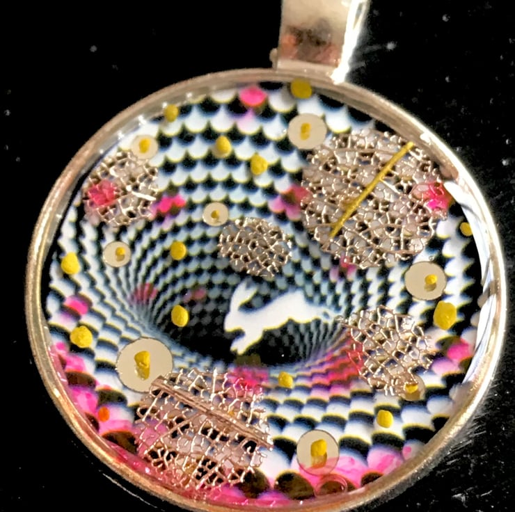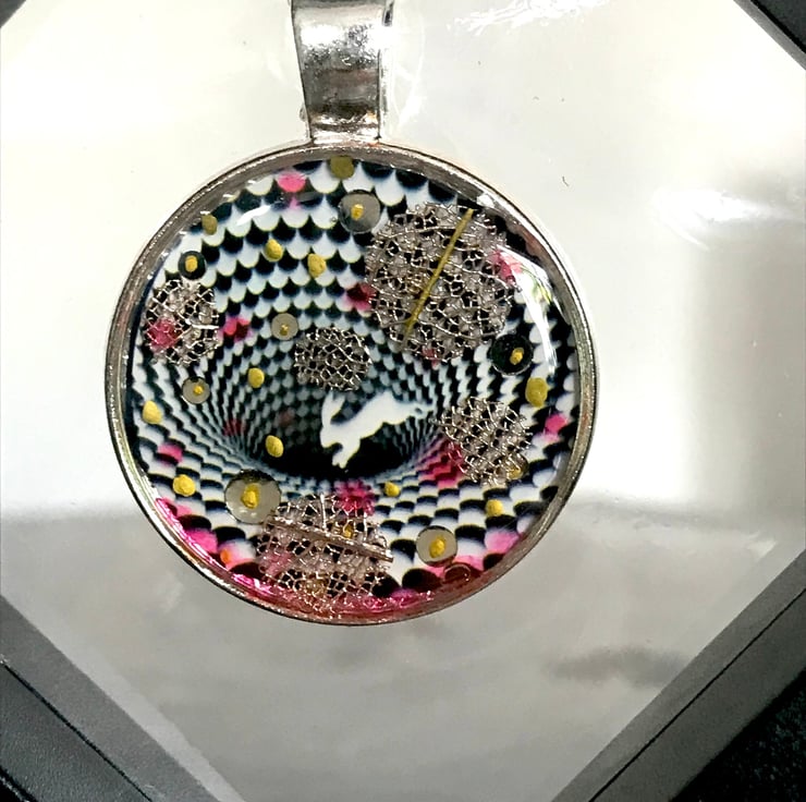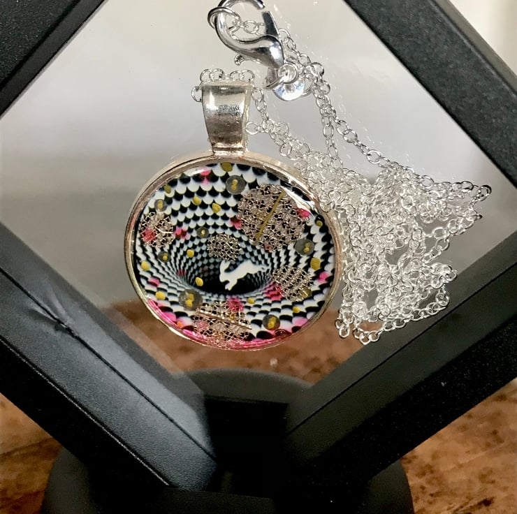 Down the Rabbit Hole Pendant silver plated necklace optical illusion, FREE display case one of a kind handmade mini art M.C Escher and Alice in Wonderland inspired striking piece