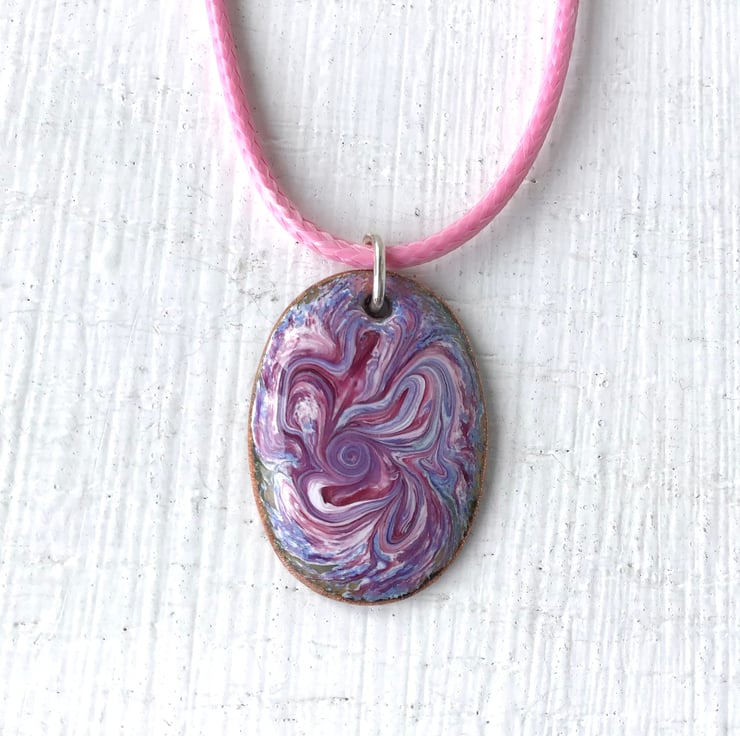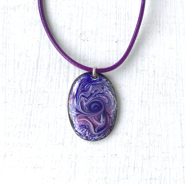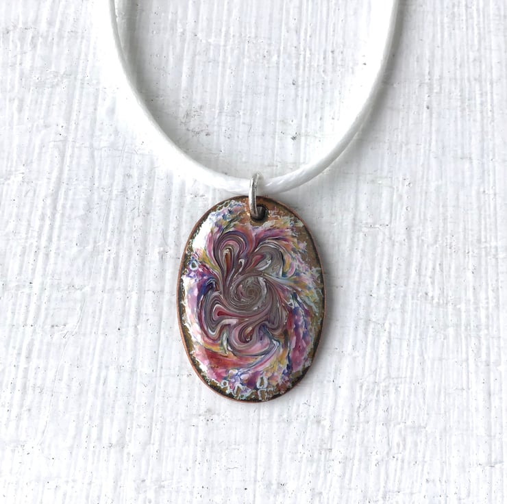 These beautiful pendants have a fascinating swirl pattern created directly in the hot kiln and it takes time to master this lovely effect. The enamel must be heated until it is just fluid enough to swirl around using the tip of a long pointed tool. Care is needed not to over do the swirling as this will ruin the piece. After swirling, the enamel is allowed to melt a little longer until smooth once more, then removed from the kiln to cool. It is not until this point that it is possible to judge if the Pendant is a success.
