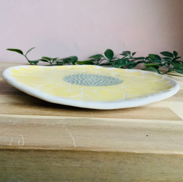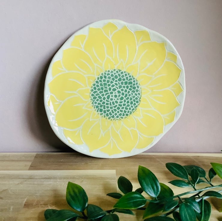 Handmade stoneware pottery plate decorated with a large buttery yellow sunflower.