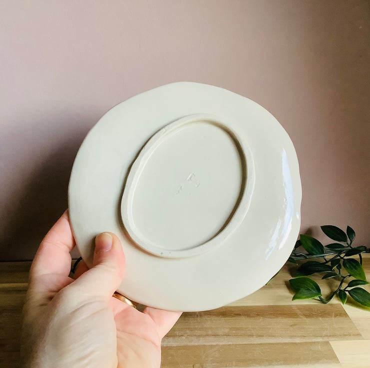 Decorated using the sgraffito technique, where the design is carved into layers of coloured slip. I then finish with small dots of contrasting colours.