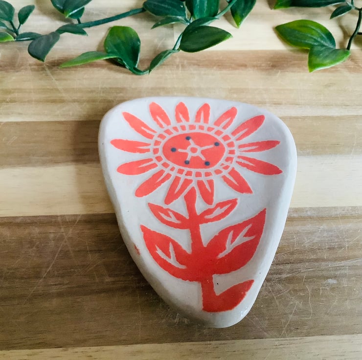 Handmade stoneware pottery ring dish decorated with bright red flower.
