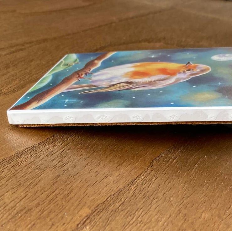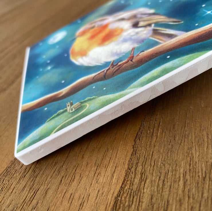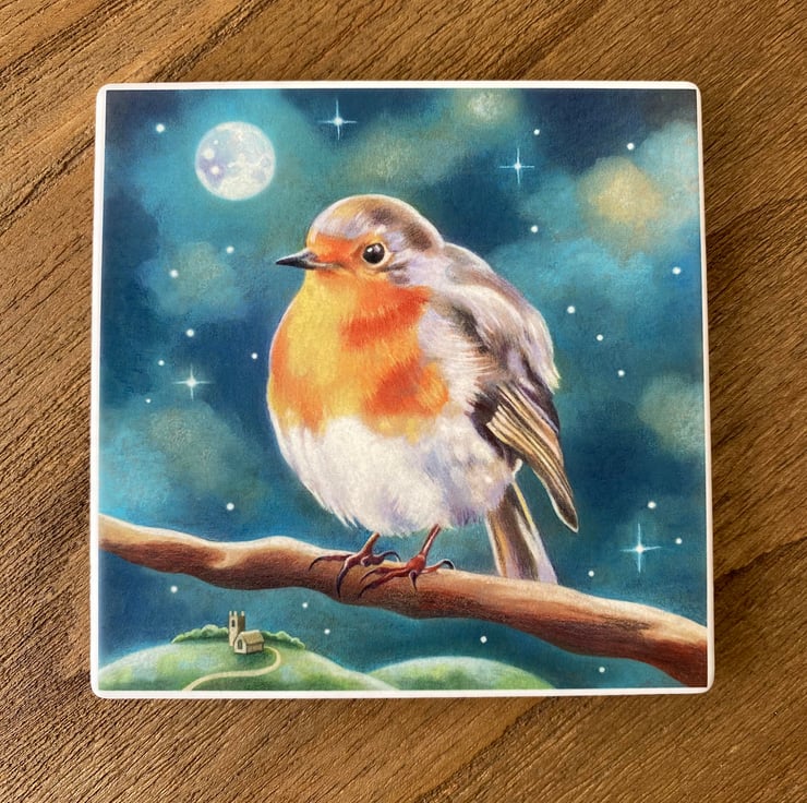 This unique ceramic coaster has a lovely, smooth sandstone finish, with a cork back (please see last picture). It shows off my 'Robin on a Full Moon Night' illustration beautifully. I created the original artwork using a combination of chalk pastel and pencil.