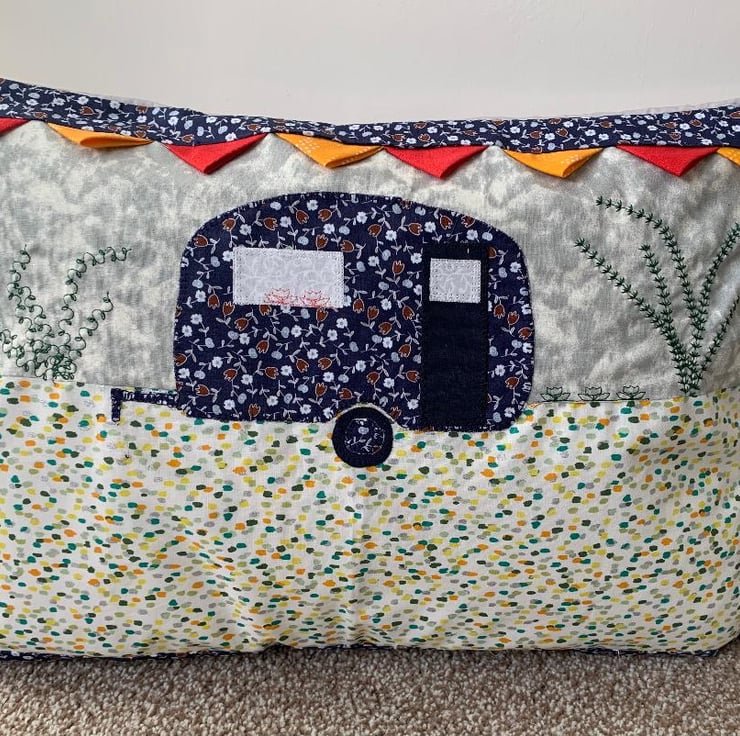 I enjoyed designing this cushion with appliqued caravan on it and adding the other decoration.