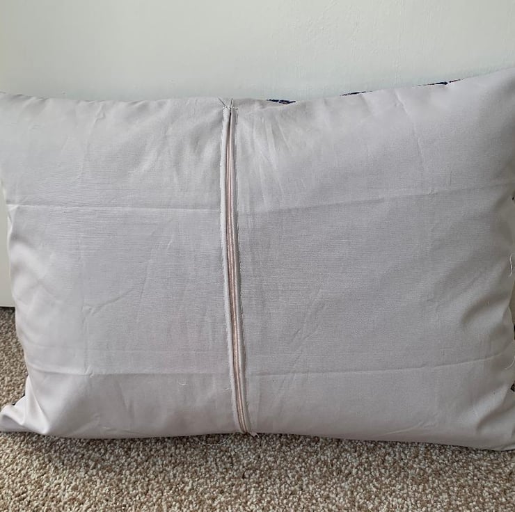 The back is pale grey cotton fabric with a zip .