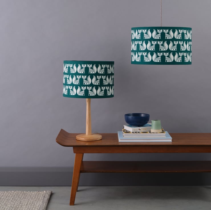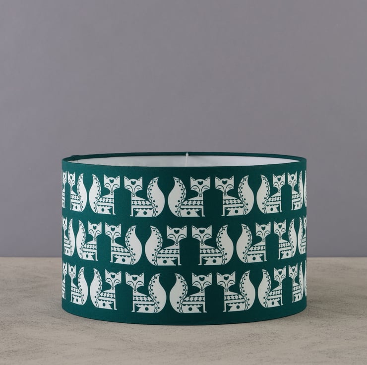 Handmade Vintage Fox Lampshade in 100% Cotton, featuring a striking teal and vintage white color mix, in a charming 3-tiered offset repeat pattern. It's the perfect statement piece for your home.
