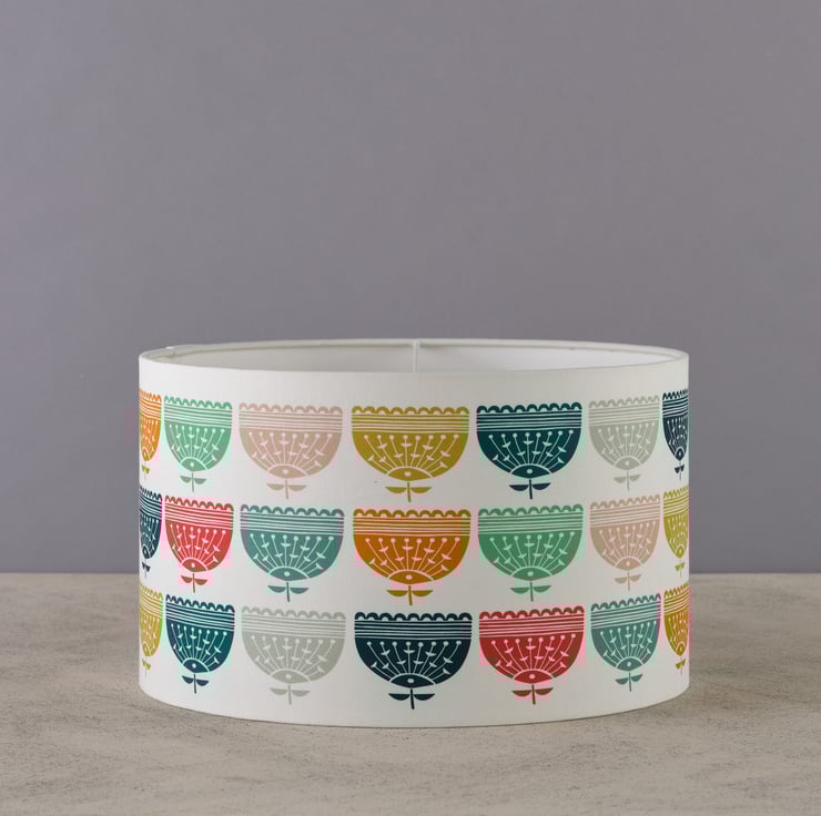 A handmade lampshade in a stunning repeating pattern with a rainbow of flowers, making a vibrant statement for your home. I