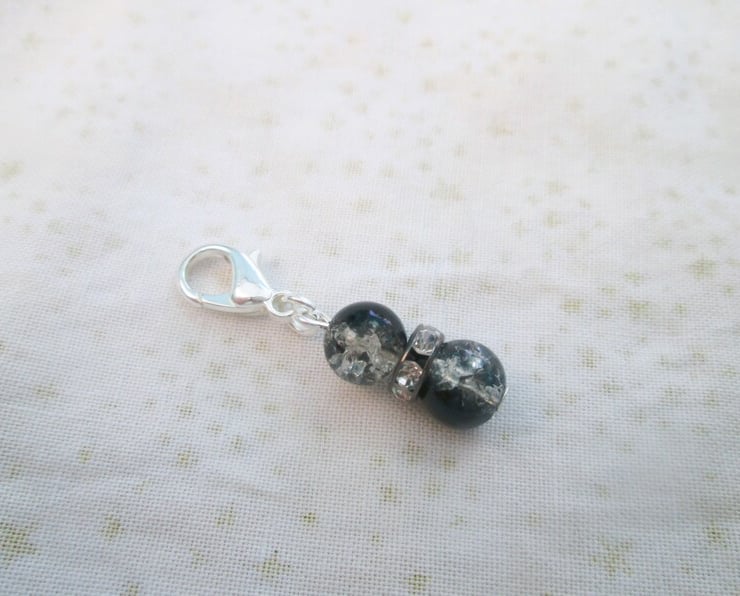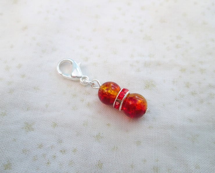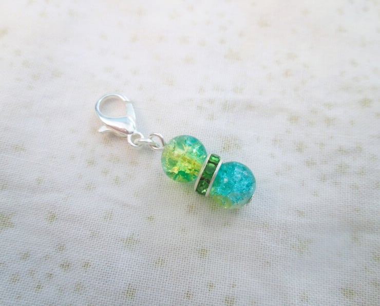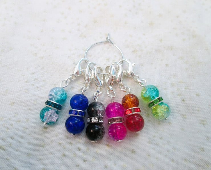 A set of 6 colourful crackle bead stitch markers / clip on charms with lobster or leverback clasps. Please choose your choice of clasps from the drop down menu.