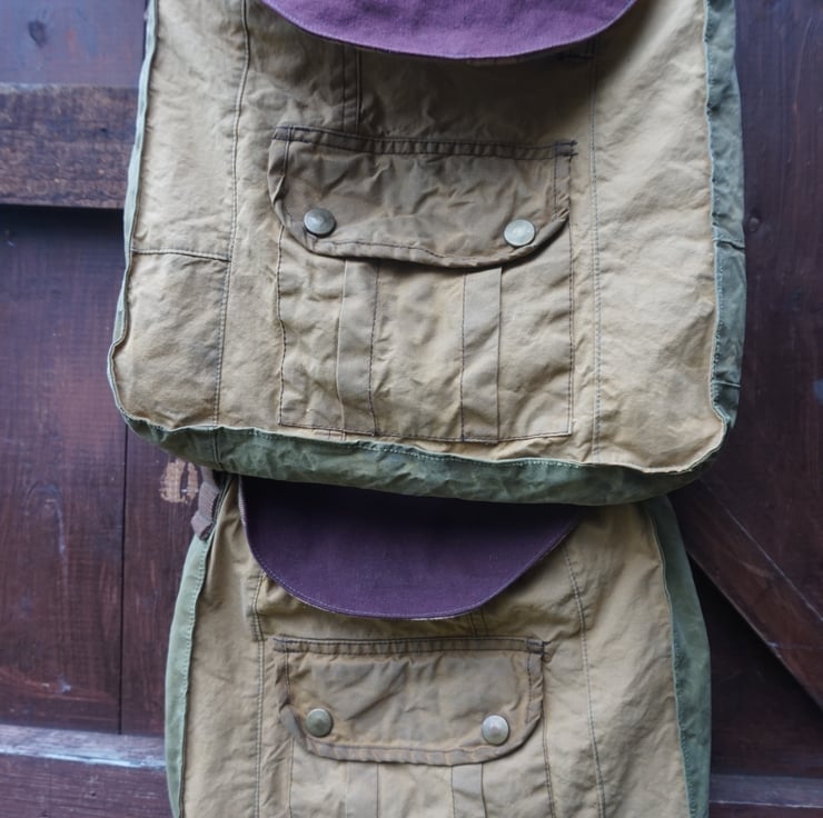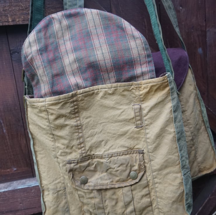 Here we have a hand made in Norfolk wax canvas messenger bag, this bag has been made from old wax jacket's, this one being a mash up of yellow, green and purple. This bag has a brown velvet lining, keeping your contents nice and safe. Purple flap to keep the elements out!