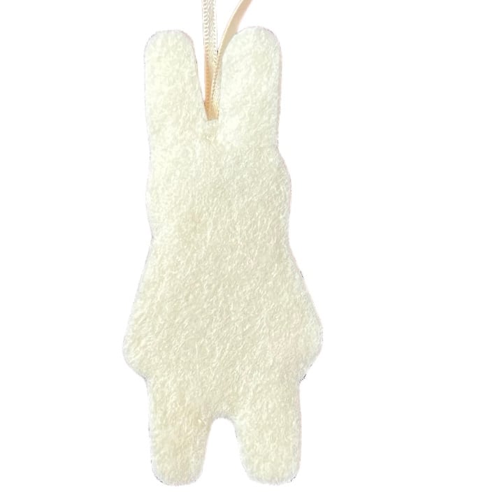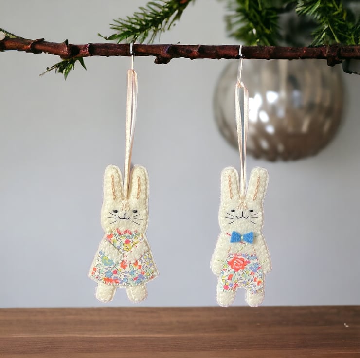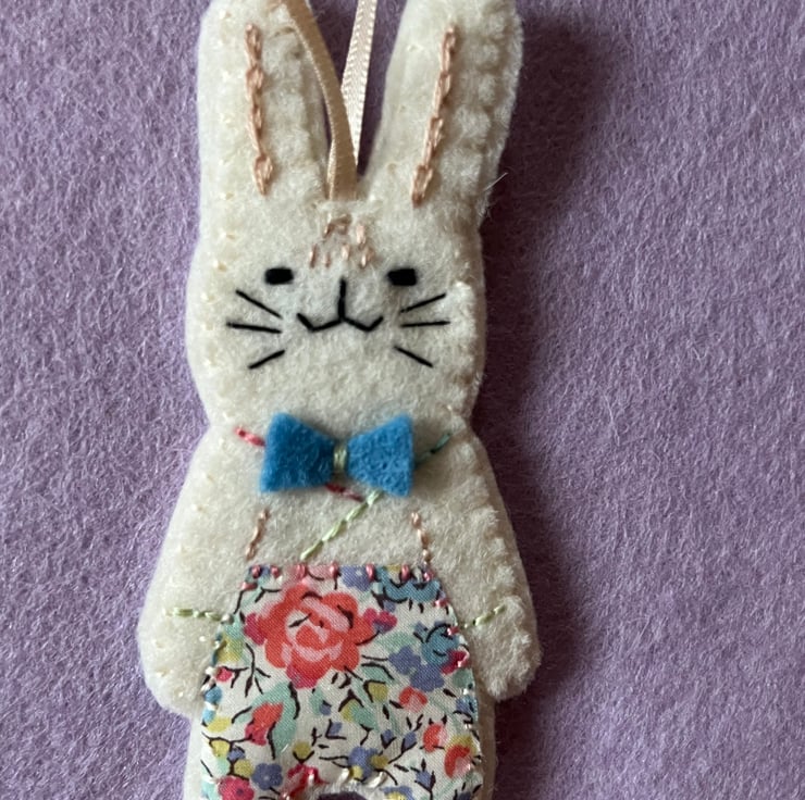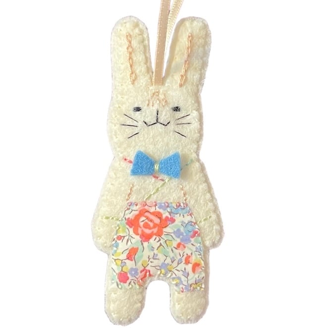 This little boy felt rabbit Decoration is wearing a pair of floral shorts.