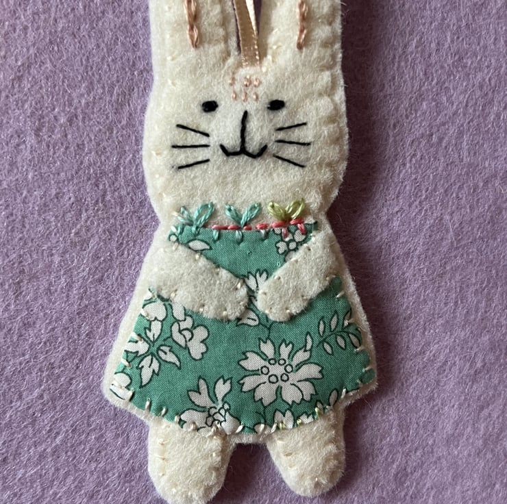 This little girl Bunny Felt Decoration is wearing a Liberty capel mint dress.