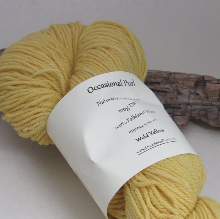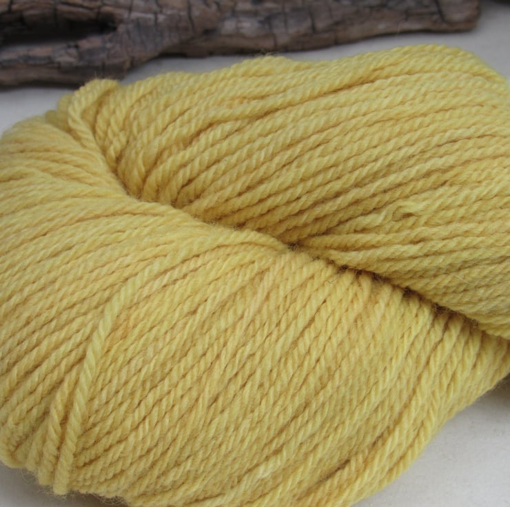 100g soft Falkland Merino yarn kettle dyed with weld flowers to a warm bright yellow