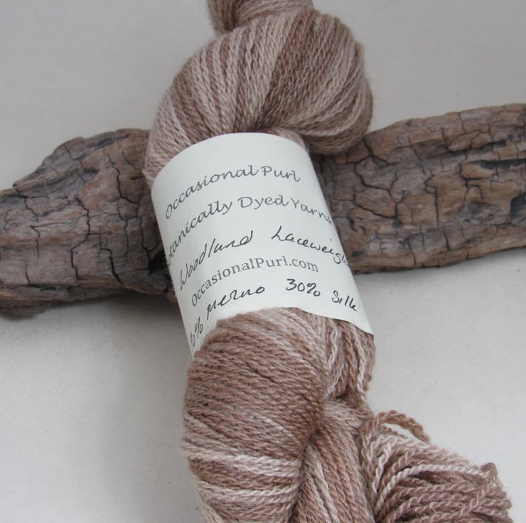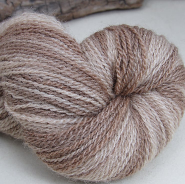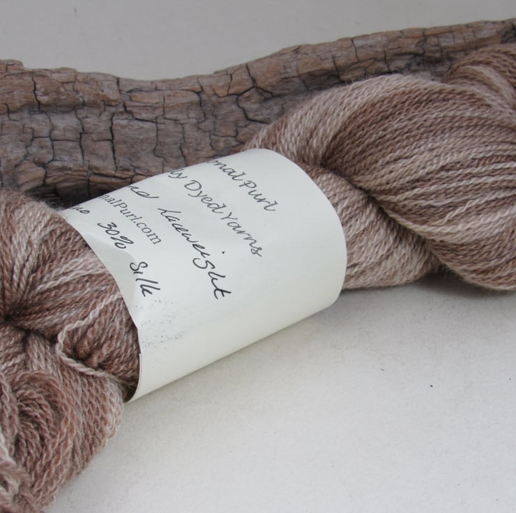 50g of soft 70% merino wool / 30% tussah silk yarn dip dyed with walnut to give a range of soft, natural browns and fawns