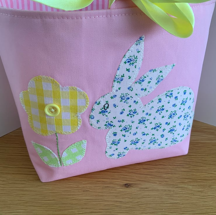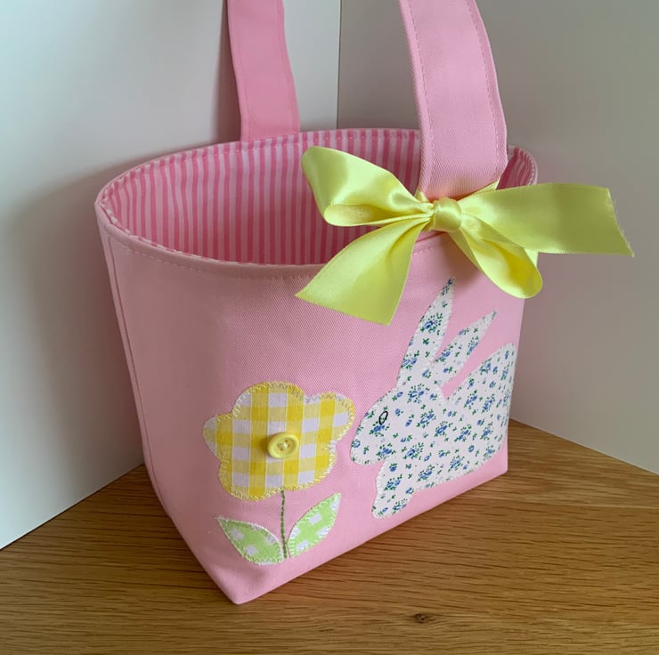 A cute little fabric Easter basket / bag made from a lightweight pink cotton fabric decorated with my own hand cut applique designs on the front, each are lined with coordinating cotton and decorated with a ribbon bow. These have all been interfaced to give them structure.