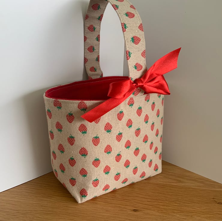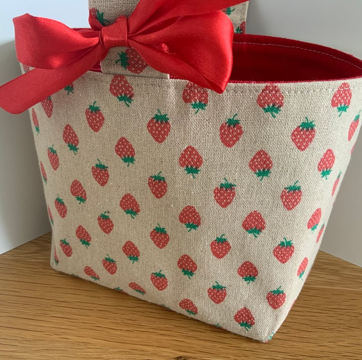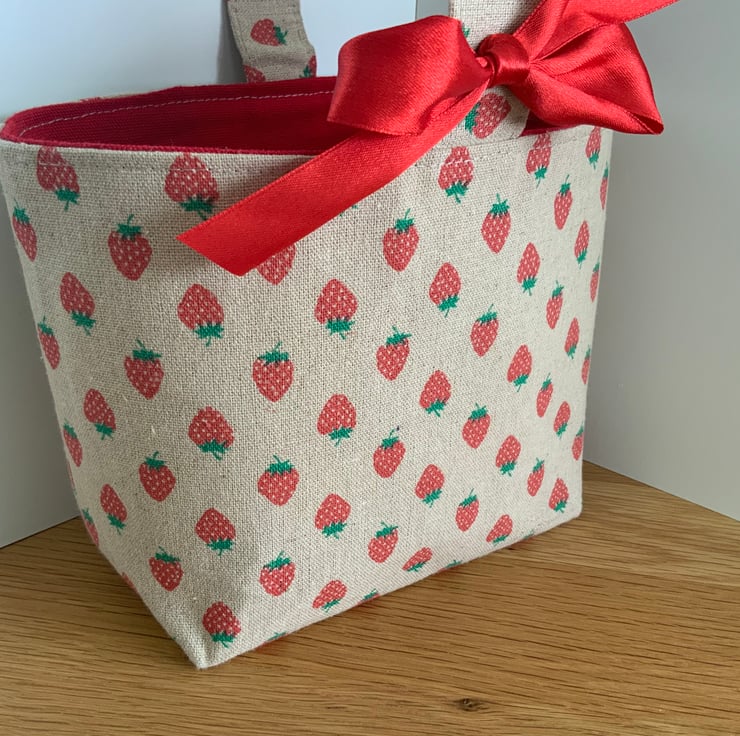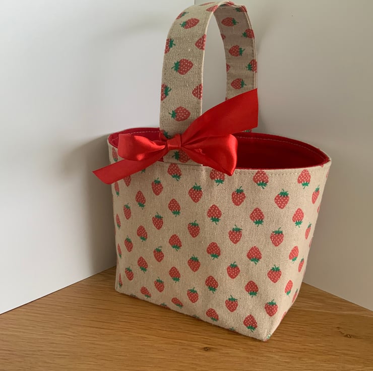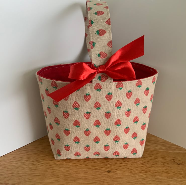 A cute little fabric basket / bag made from a canvas strawberry fabric and is lined with coordinating cotton and decorated with a ribbon bow. It has a layer of interlining in between to give it a little structure.