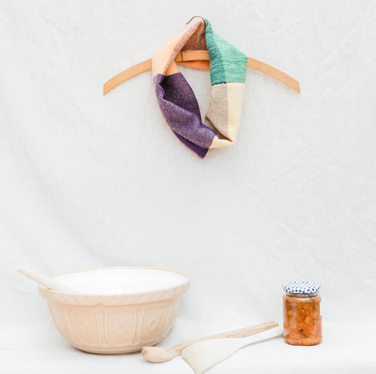 This collar / cowl is from my most recent collection called ‘At the bottom of the garden’ inspired by a new found passion for gardening throughout 2020. During the lockdown periods I immersed myself into slowly transforming my garden, creating some vegetable beds and growing plants from seeds. I watched as slowly the seedlings grew, became plants and then produced a harvest. My time has grown in the garden throughout 2021 and has continued to inform my practice. I remain inspired by fruit and vegetables, drawing on the incredible colours found within nature and translating these into hand woven products.