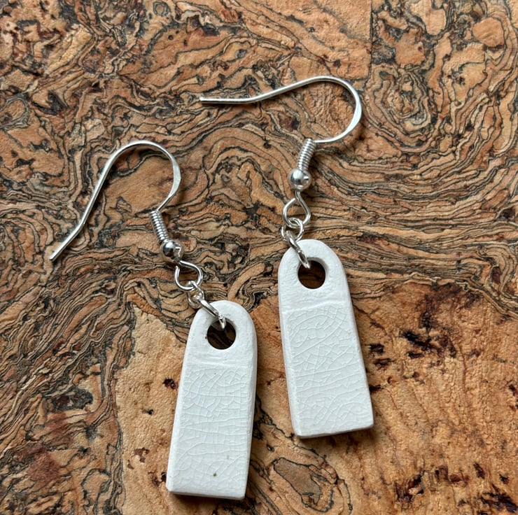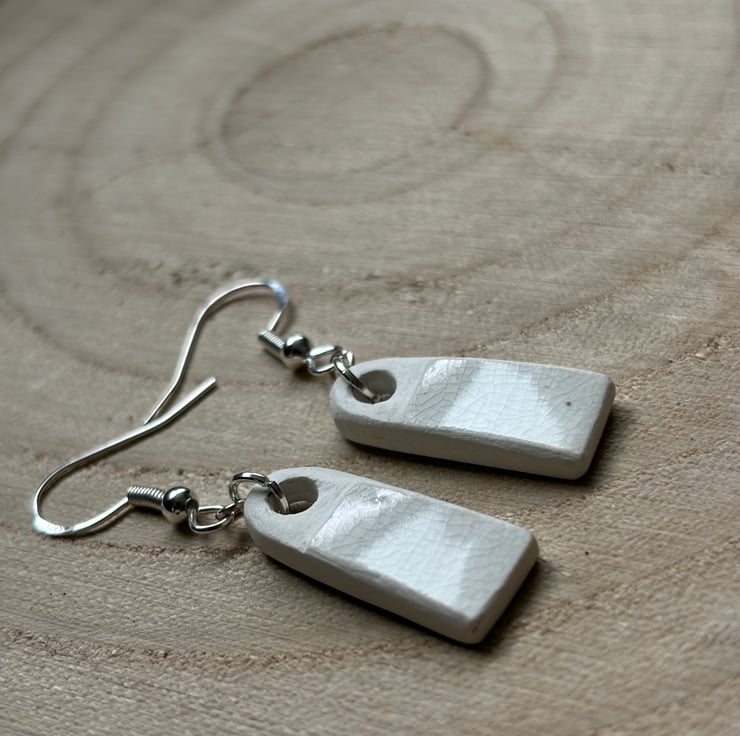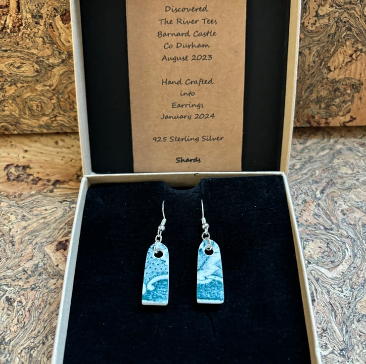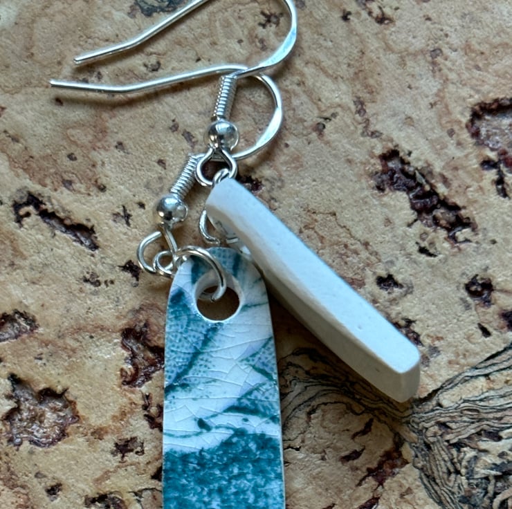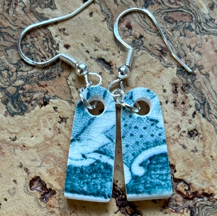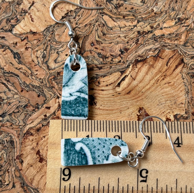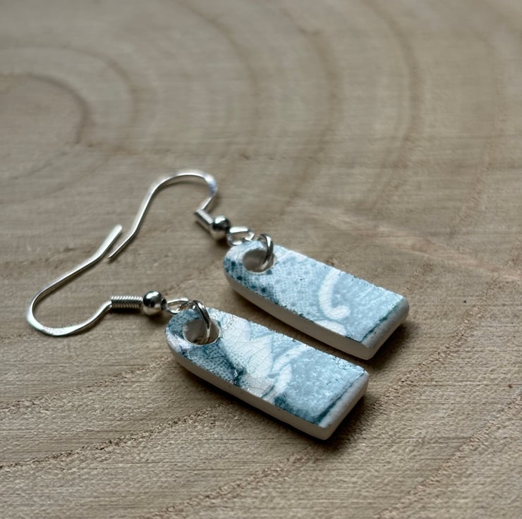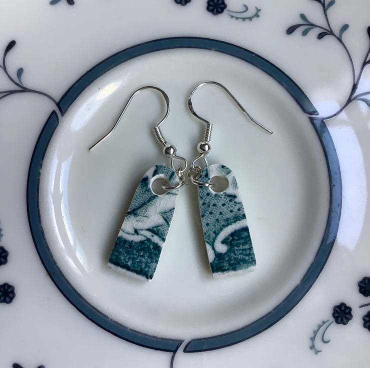 I found a small striking shard of ceramic, part of a rim of a plate. After a thorough clean I was able to drill holes and shape into two pairs of earrings. This pair are the larger with front and back glaze in tact with the area around the hole is sanded and sealed with eco friendly matt sealant.