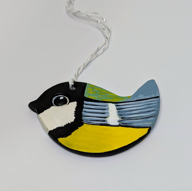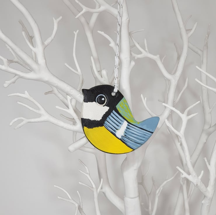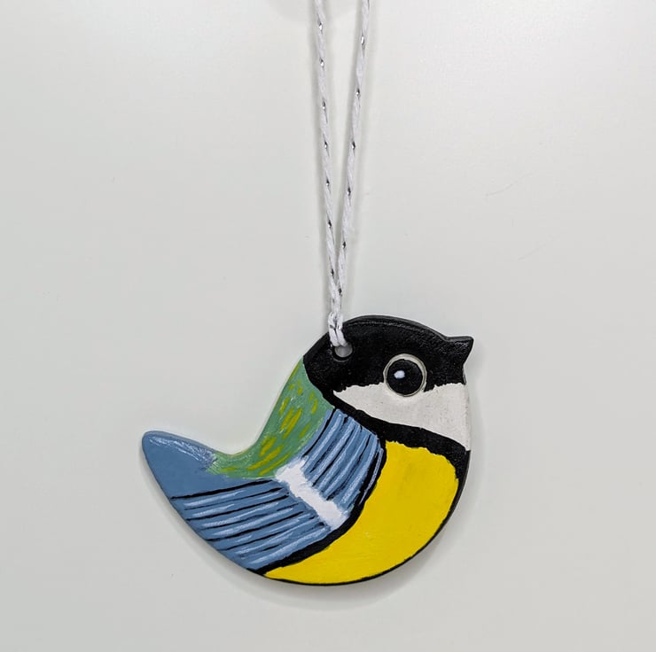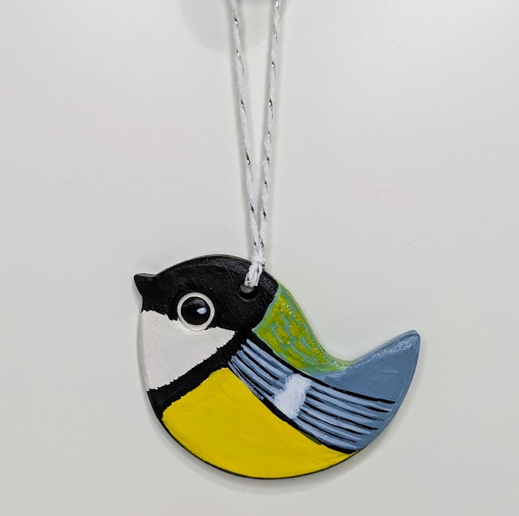 Beautiful great tit, garden bird, hanging decoration which has been handcrafted from air dry clay and decorated on both sides with acrylic paints and varnished. This cute bird would look lovely displayed in a window, from a handle or piece of furniture.