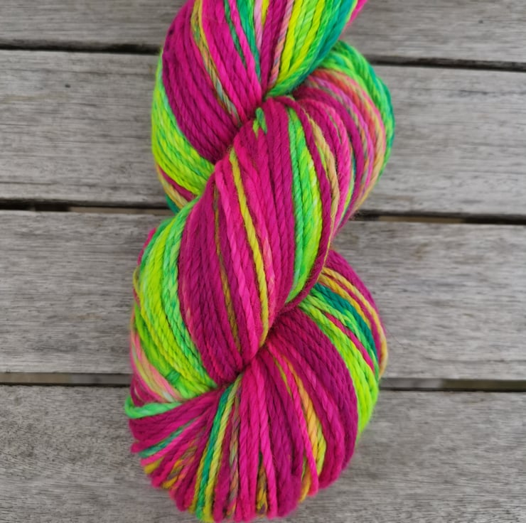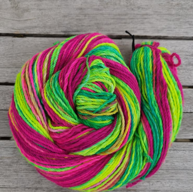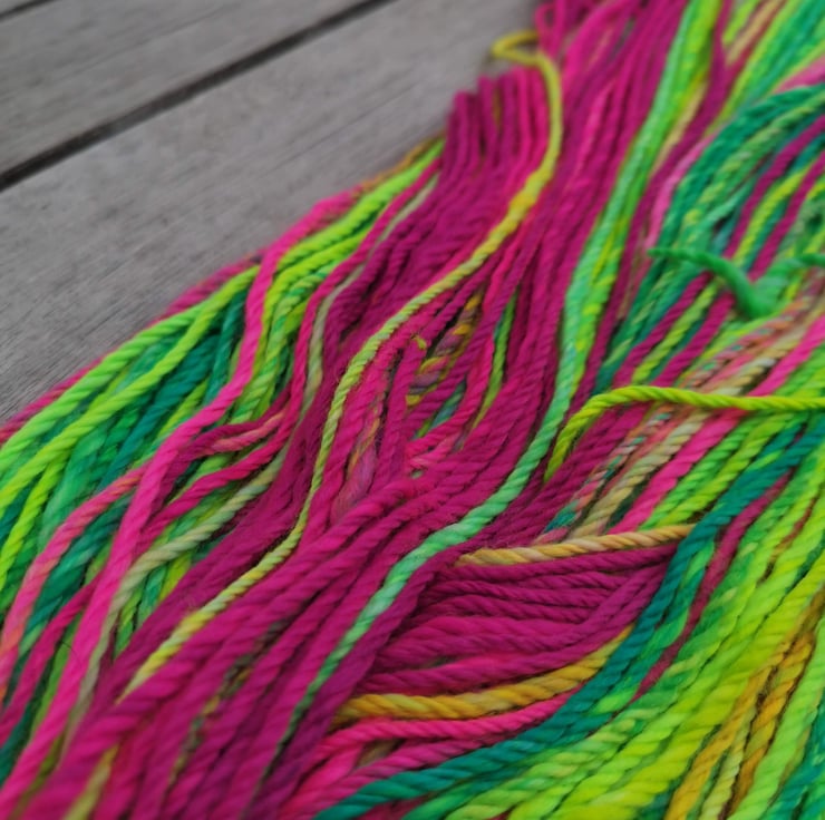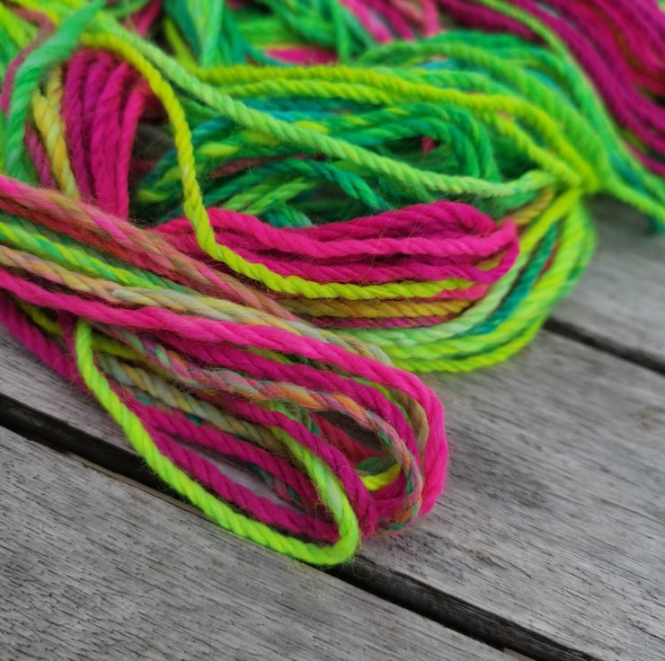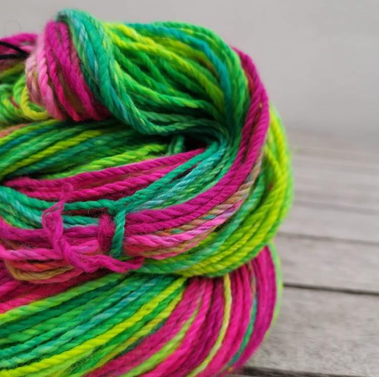 This yarn is spun on a drop spindle by a human being, not a machine, and therefore contains variances that make it unique. You are buying a one of a kind product!