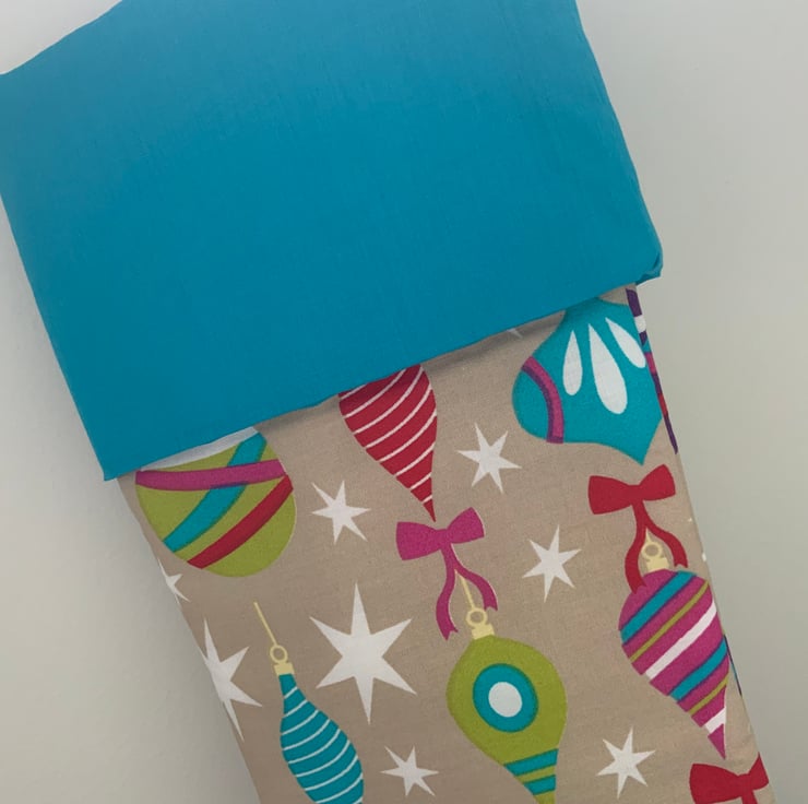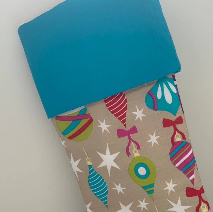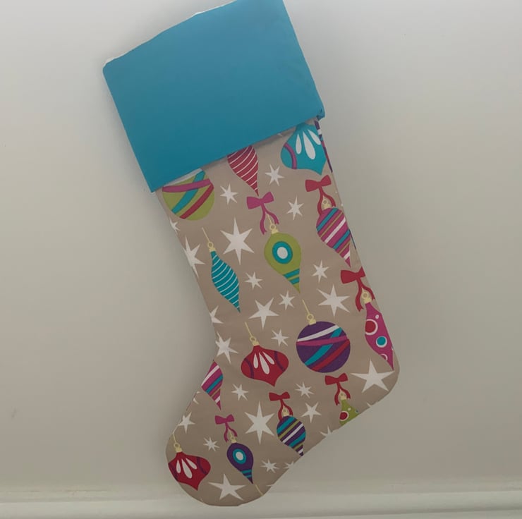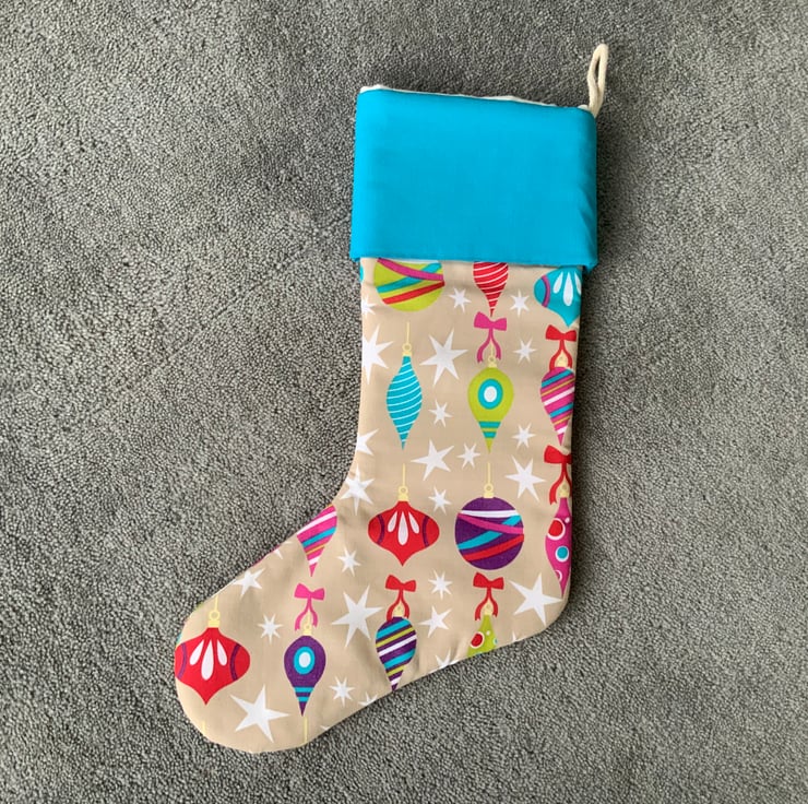 Gorgeous handmade Christmas Stocking with cotton cuff. It is fully lined in cream cotton with bonded interlining giving a lovely padded feel. Finished with a cotton cord loop for hanging.