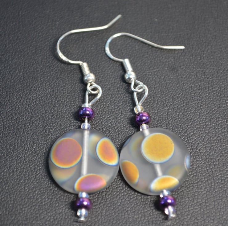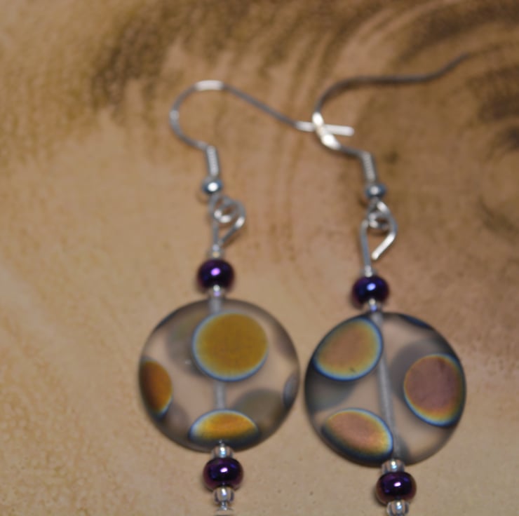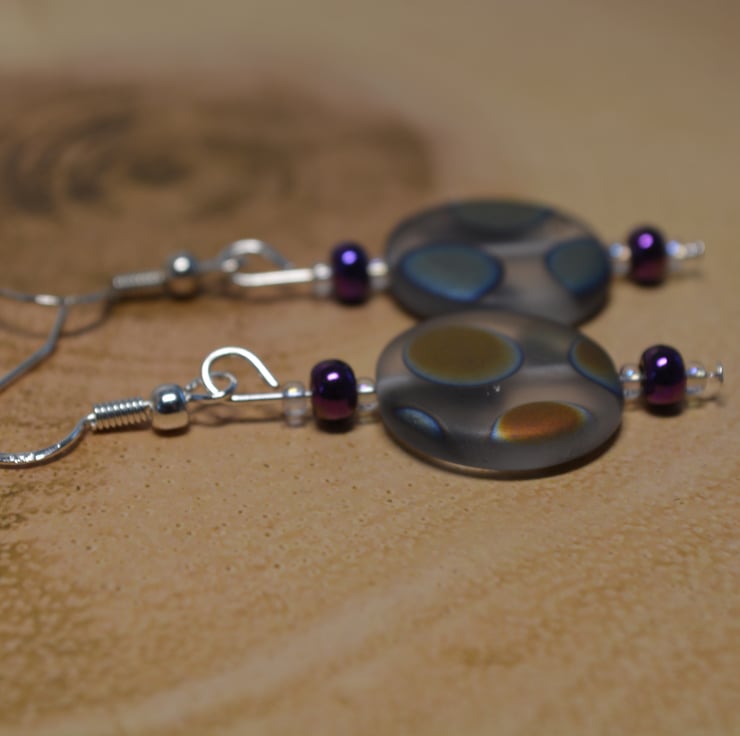 Earrings with a clear round peacock bead with large metallic seed bead and small clear crystal seed beads above and below. The earring hooks are stirling silver.
