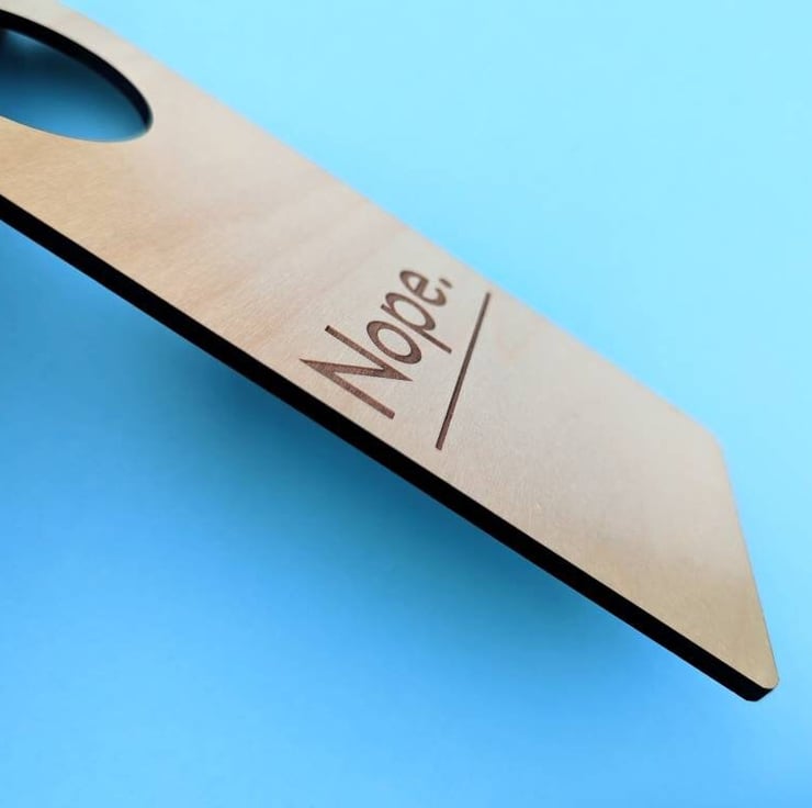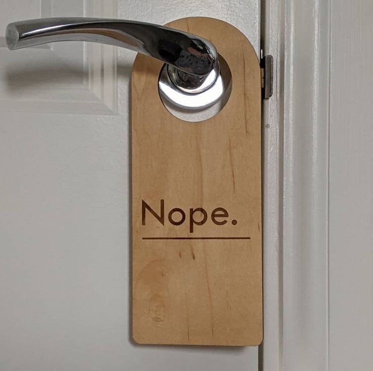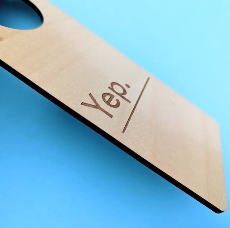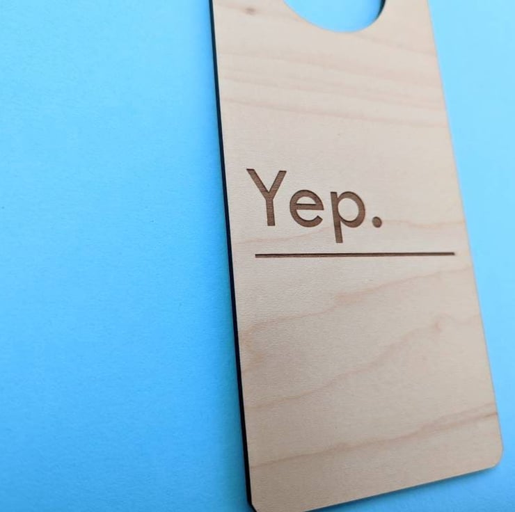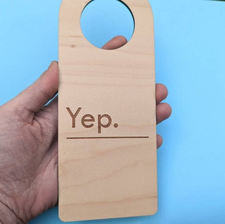 This article is a quality-finished, laser engraved Yep Nope do-not-disturb door hanger. The hanger is 2-sided and shows a do-not-enter (nope) message on one side and a welcome-to-enter (yep) message on the other side.