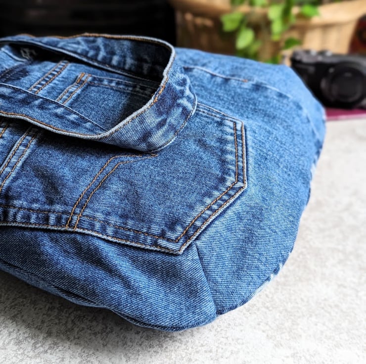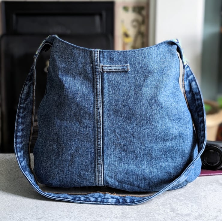With a 'lived-in' retro feel, a stylised flower print lining works beautifully with the upcycled denim.