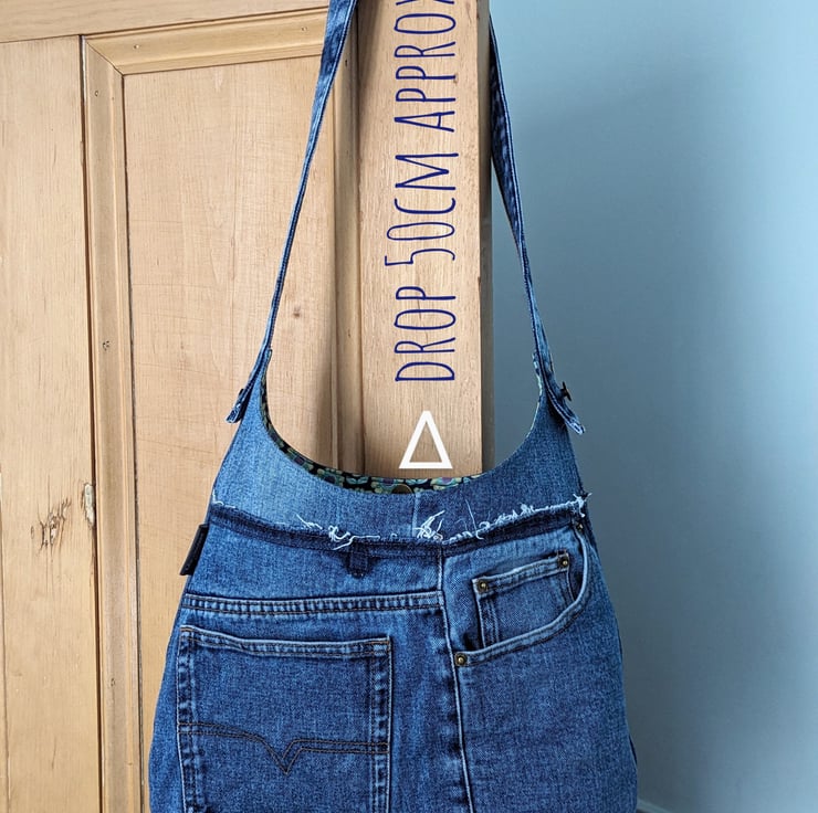 A long shoulder strap is made by re-purposing the waistband of the jeans and is attached to the bag with the addition of rivets. Whilst designed to be worn over the shoulder, with a drop of 50cm, it can be used as a high cross body bag.