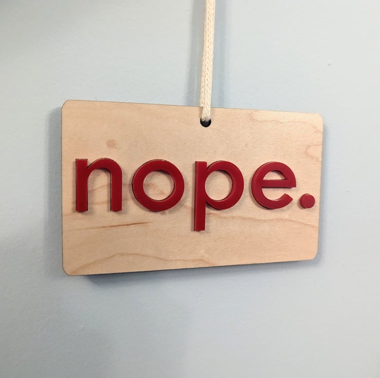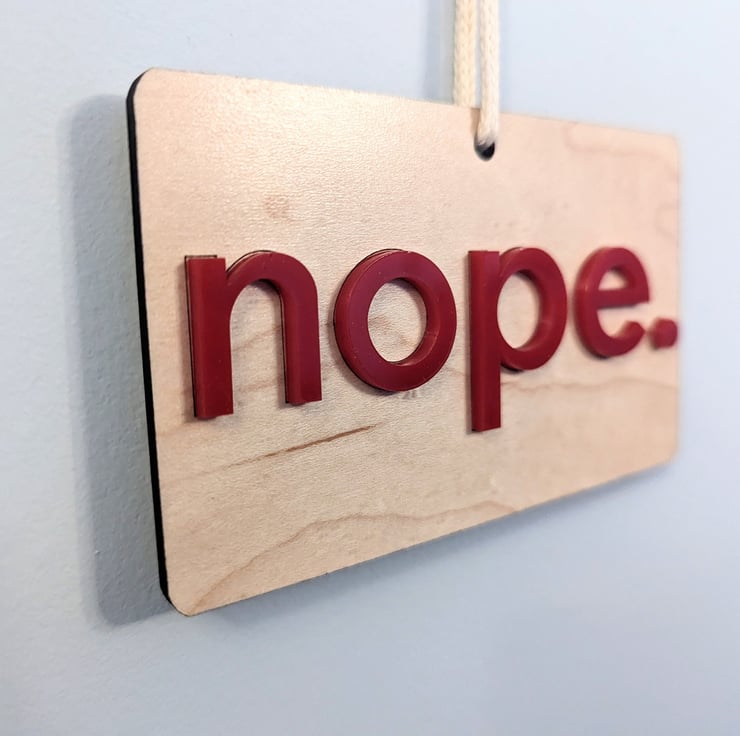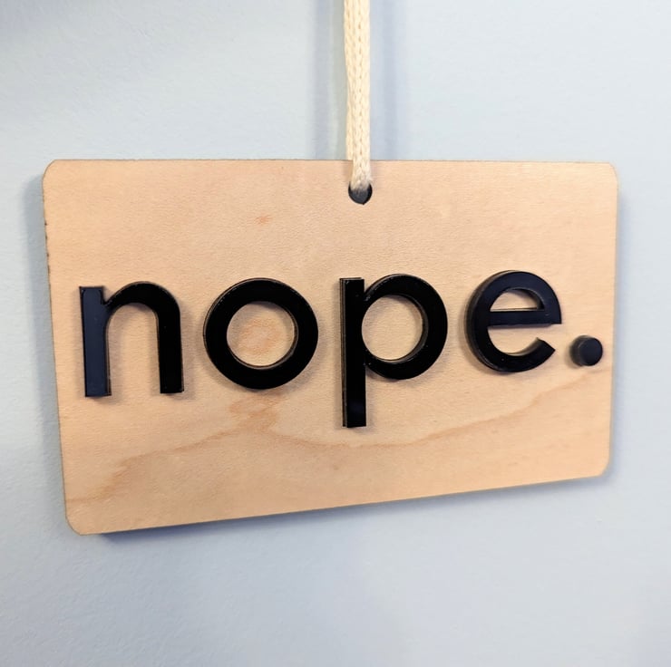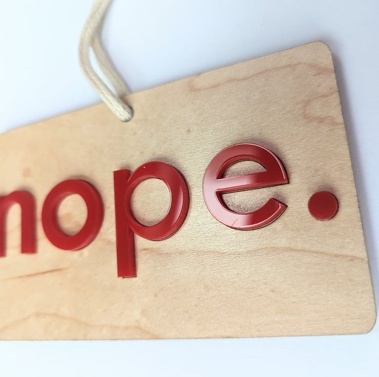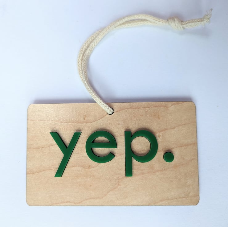 This article is a quality-finished, laser engraved Yep Nope do-not-disturb door hanger with acrylic letters on both sides and 100% cotton cord. The hanger is 2-sided and show s a do-not-enter (nope) message on one side and a welcome-to-enter (yep) message on the other side with 3D acrylic letters.