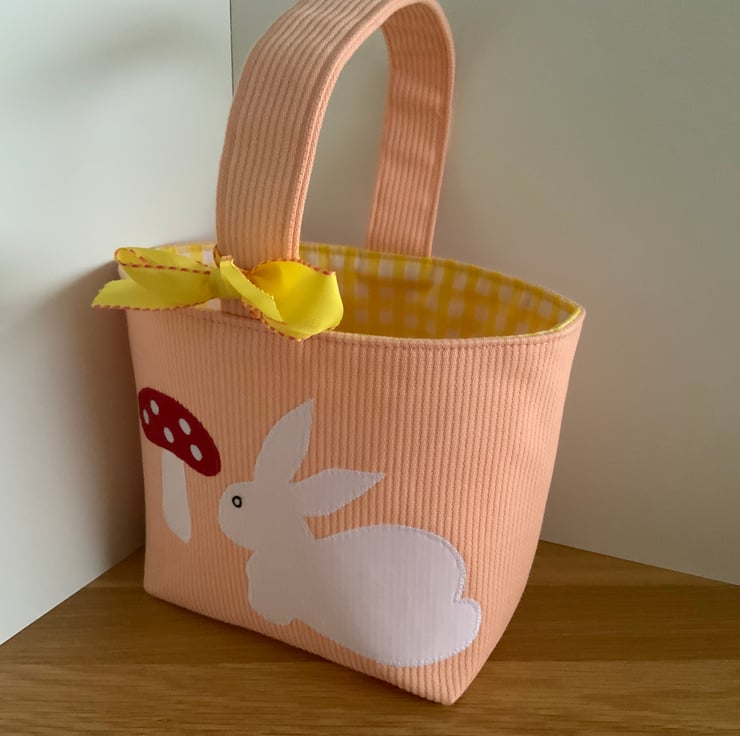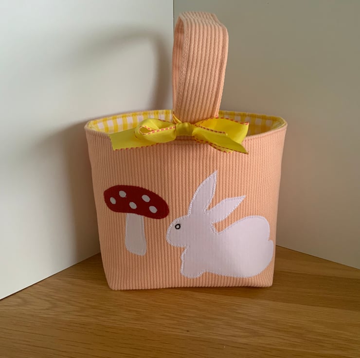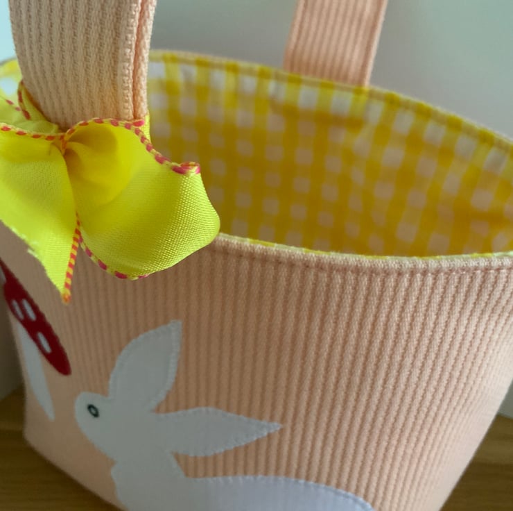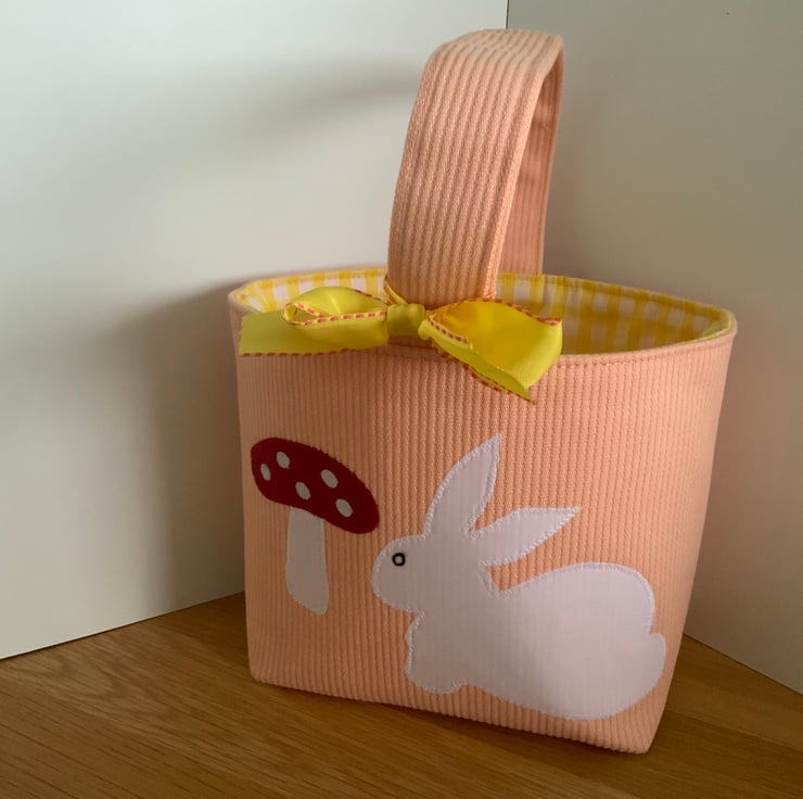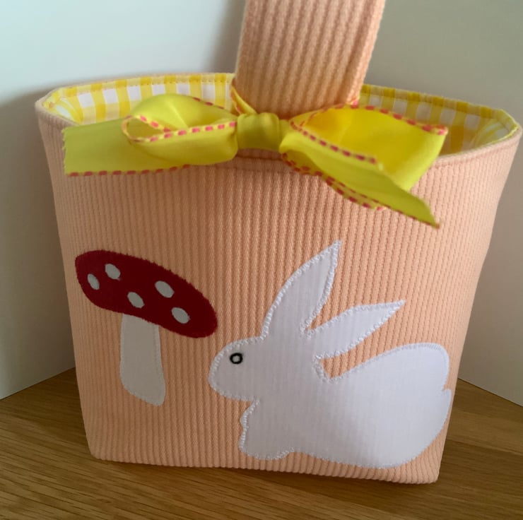 A cute little fabric Easter basket / bag made from a heavyweight orange cotton fabric decorated with my own hand cut applique designs on the front, each are lined with coordinating cotton and decorated with a ribbon bow. These have all been interfaced to give them structure.