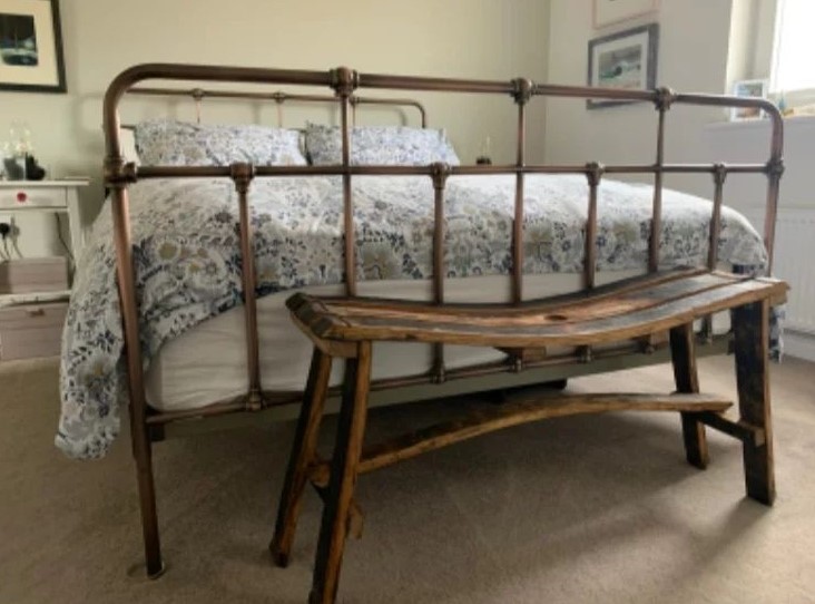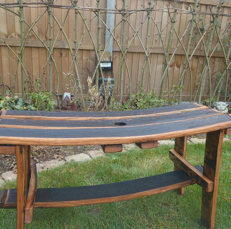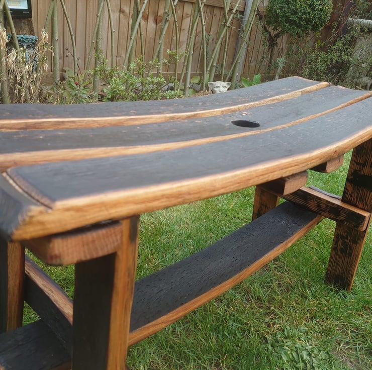 Using the full staves from a whisky barrel to make a rustic oak bench. The width of the bench matches the height of the barrel when it was drilled. The black charing on the benchtop comes from when the coopers burn the barrel during whisky making. These benches are treated for inside and outside use.