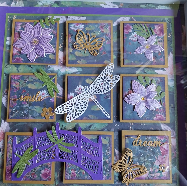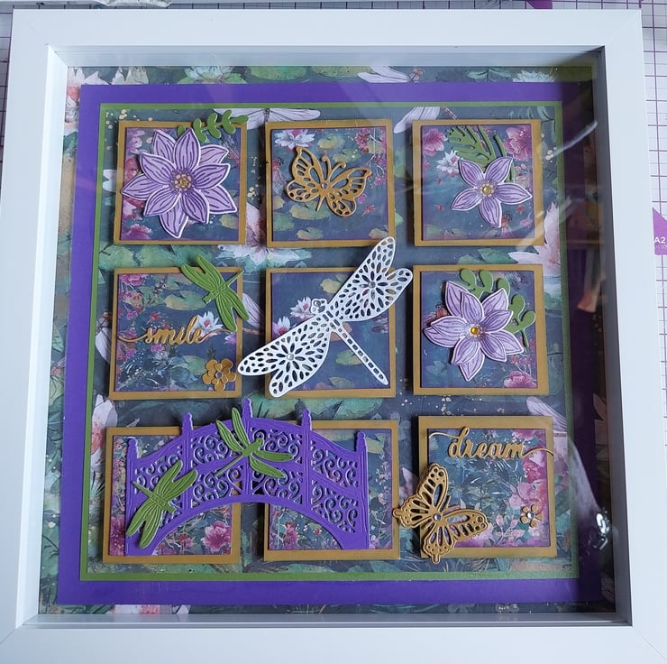 A 10 x 10 inch box frame picture with a Dragonfly theme. The perfect gift for Mother's day, Valentines day or just because. Handmade using paper and card in my Somerset Studio