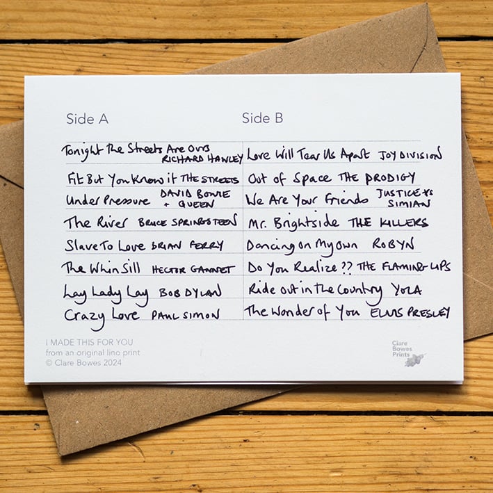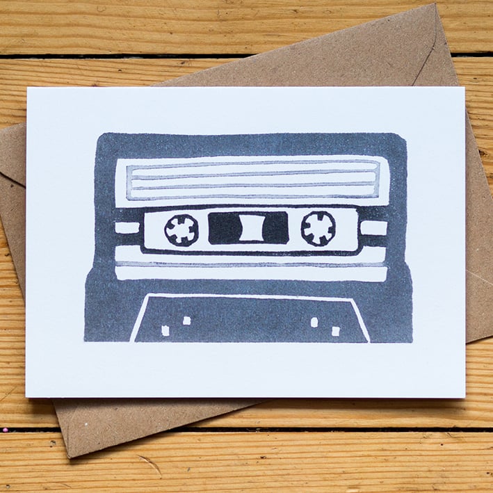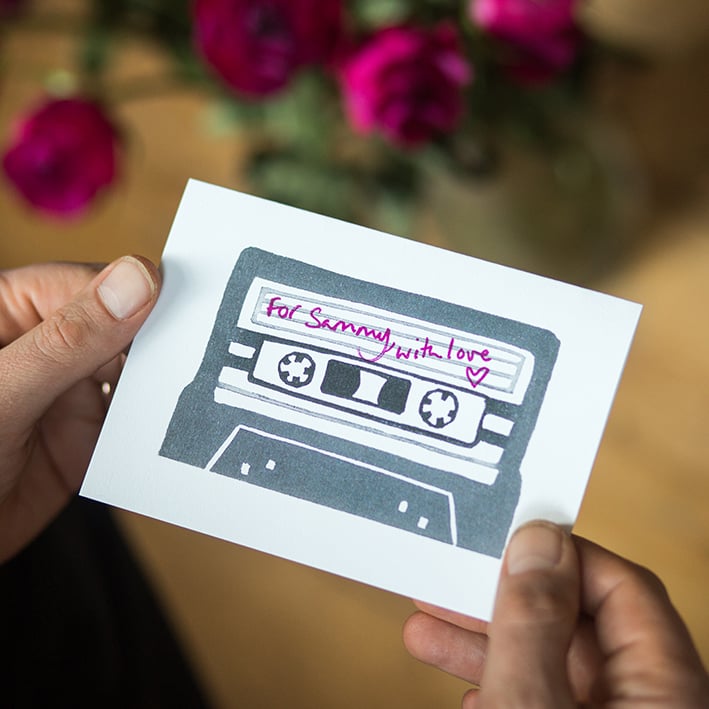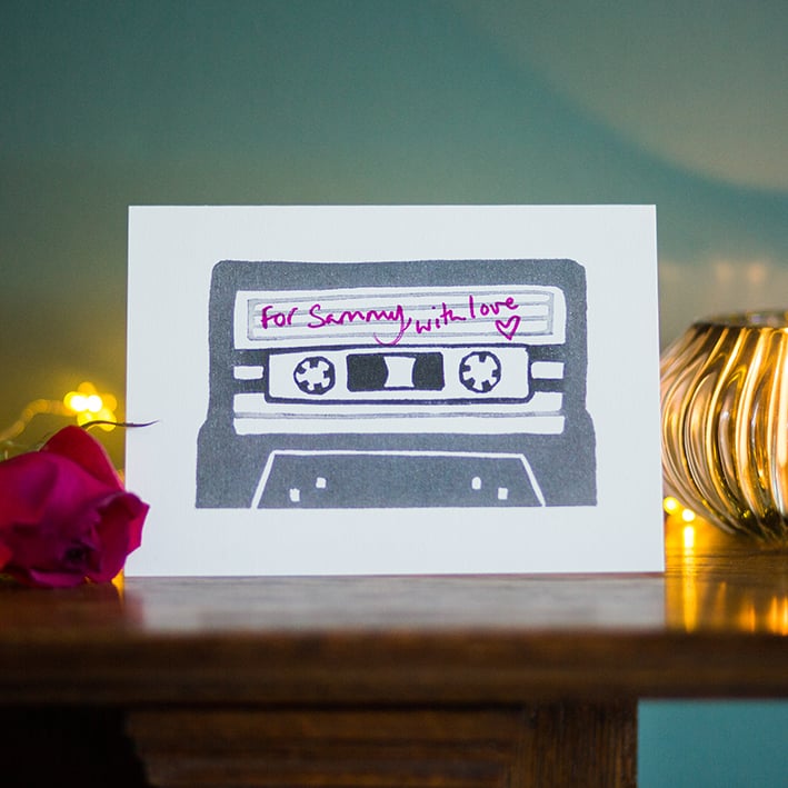I was thinking about making an original print of a mixtape to give as a gift for Valentine's Day, but then considered the size of an old fashioned cassette tape and thought that actually it would suit being a card better... the fun addition would be to design the back of the card as the back of a tape, so you can fill in your loved ones favourite tunes... I really did have fun doing this bit! Think this will work as a great Valentine's card, but also a first anniversary (paper) card... or a excellent one for music/nostalgia lovers!