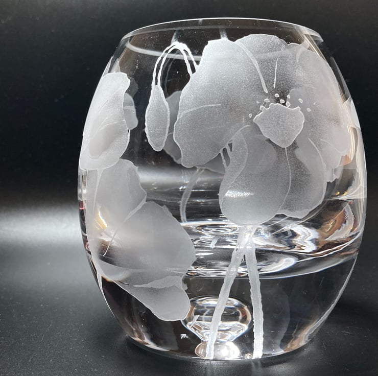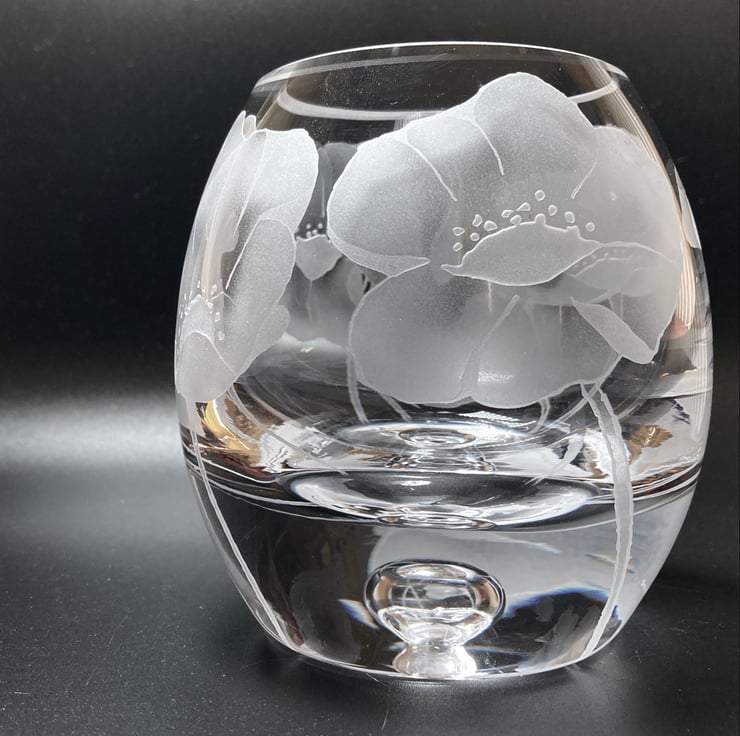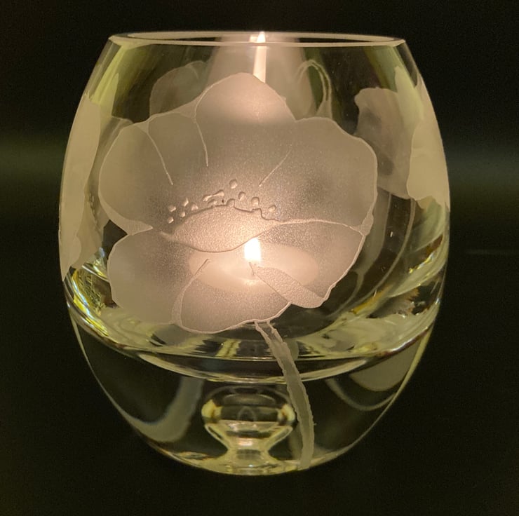 This is a one off tealight holder that I’m selling as part of Folksy’s Seconds Sunday. A lovely solid and stable piece of glass it is decorated with a unique design of poppies that would make a wonderful gift. A great opportunity to buy a unique piece of glass at a knockdown price!