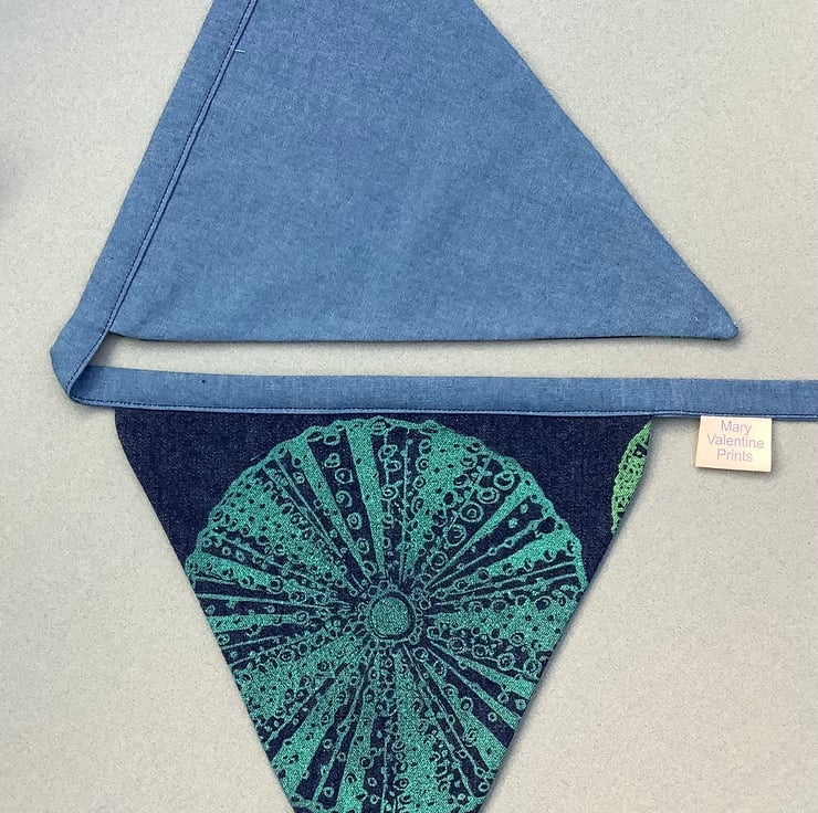 The bunting is 4m25cm long, has 14 flags and has a loop at each end for hanging. The flags measure 26cm by 22 cm and are lined with light weight denim.