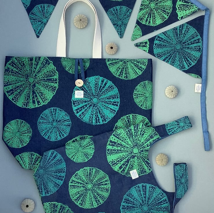 It is printed in green and turquoise onto denim fabric using speedball fabric inks.