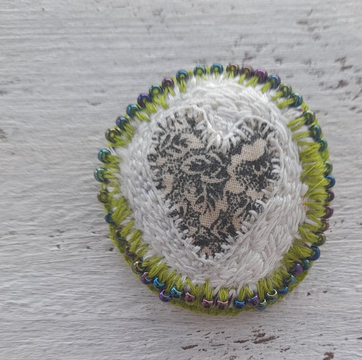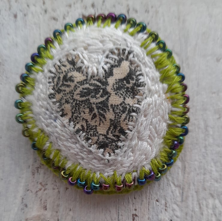 This hand stitched brooch is perfect for a loved one made with vintage textiles, it has a silver plated brooch back and some pretty glass beads it measures approx 5 cm x 5 cm. comes with a gift pouch