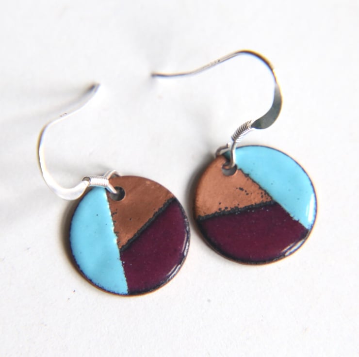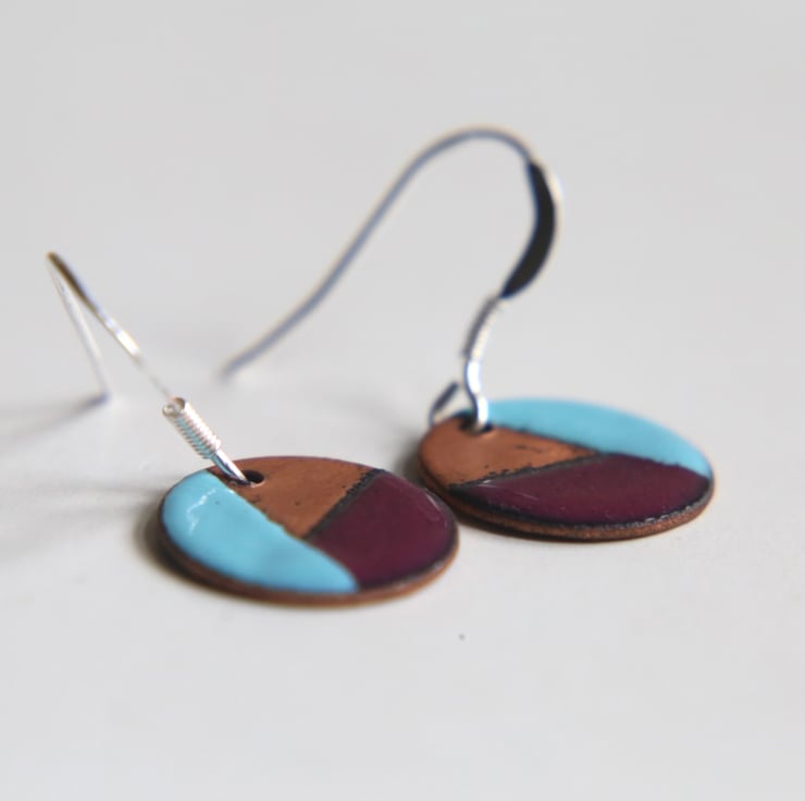 16mm copper earrings enamelled with deep purple and turquoise enamel sections.