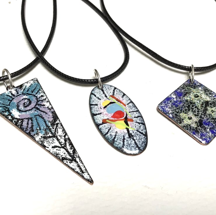 These Enamelled Pendants are all original designs, they are made by re-cycling previously made pieces re-enamelled to create new unique pendants. You can buy them individually or as two together, or a group of three pendants in different shapes with a gradually reducing price. As individual pendants are bought I will update this listing with a unique replacement.